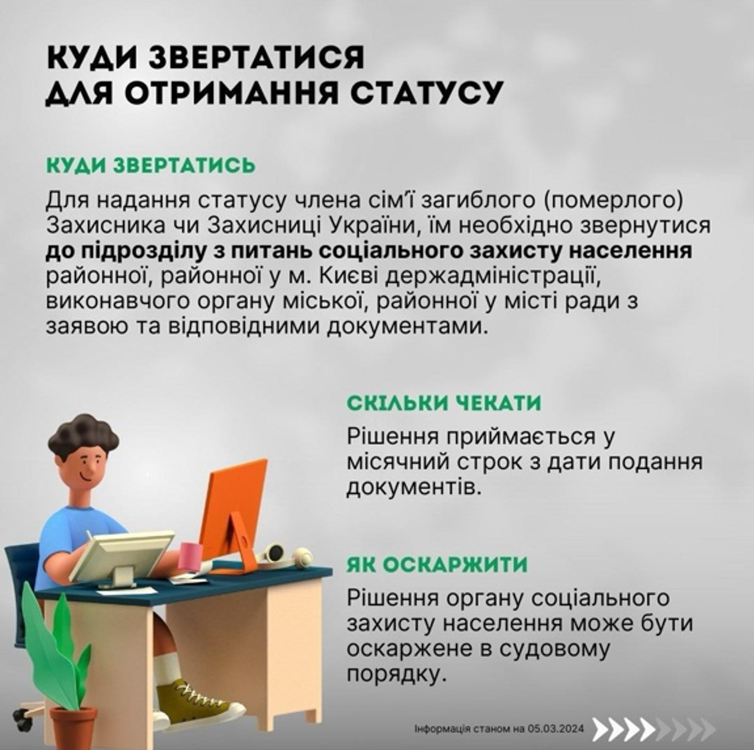 Для набуття статусу члена сім’ї загиблого Захисника чи Захисниці України слід звертатися до підрозділу з питань соціального захисту населення районної, районної в місті Києві держадміністрації, виконавчого органу міської, районної в місті ради із заявою та відповідними документами.