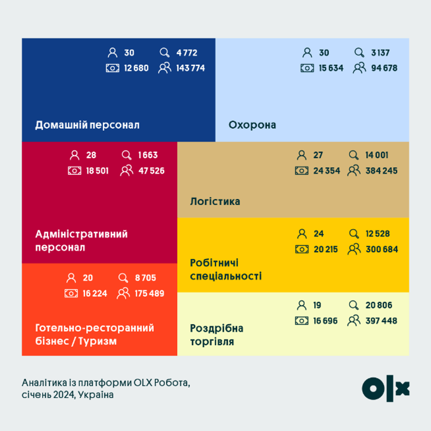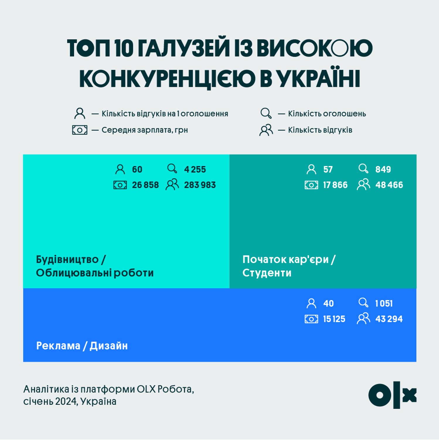 Зазначається, що найвища конкуренція на платформі зафіксована у галузі «Будівництво/облицювальні роботи», де на одне оголошення в середньому припадає 60 відгуків. Середня заробітна плата становить 26 858 гривень.