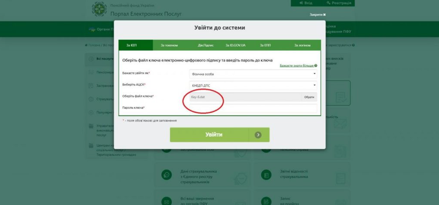 • Крок 1. На веб-порталі Фонду в правому верхньому куті екрану натисніть кнопку «Вхід» та авторизуйтеся за допомогою кваліфікованого електронного підпису (КЕП).
