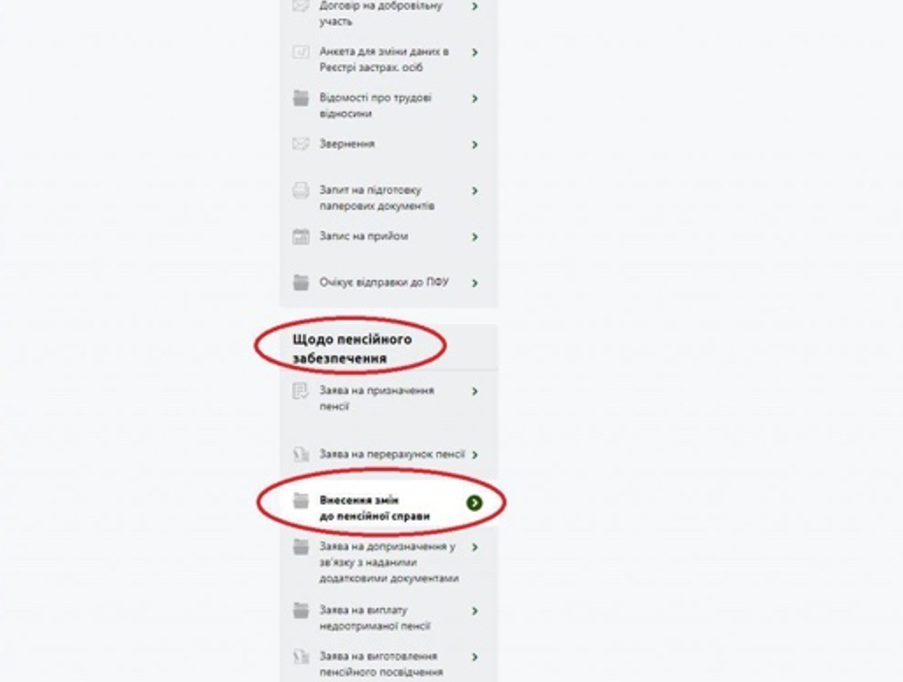 • Крок 2. В особистому кабінеті на панелі зліва в розділі «Щодо пенсійного забезпечення» оберіть опцію «Внесення змін до пенсійної справи».