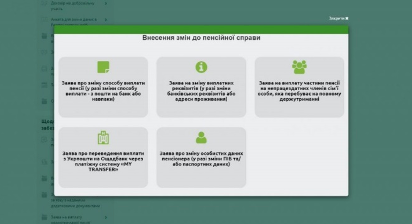 • Крок 3. Оберіть одну з необхідних заяв: «Заява про зміну способу виплати пенсії (у разі зміни способу виплати –– з пошти на банк або навпаки)», «Заява на зміну виплатних реквізитів (у разі зміни банківських реквізитів або адреси проживання)», «Заява на виплату частини пенсії на непрацездатних членів сім’ї особи, яка перебуває на повному держутриманні», «Заява про переведення виплати з Укрпошти на Ощадбанк через платіжну систему MY TRANSFER», «Заява про зміну особистих даних пенсіонера (у разі зміни ПІБ та/або паспортних даних)». Натисніть на обране вікно.