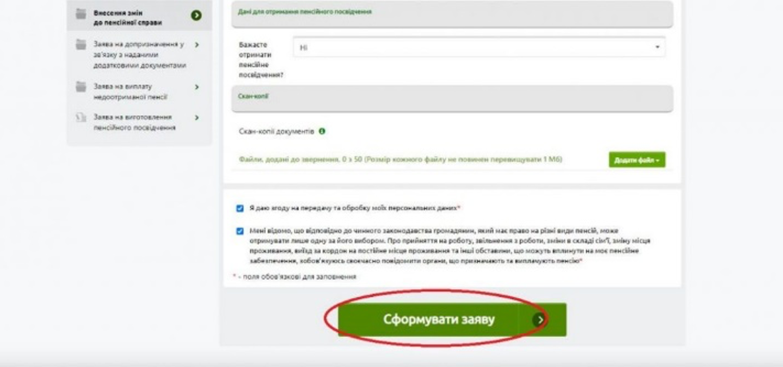 • Крок 6. Надайте згоду на передачу та обробку персональних даних та підтвердіть, що ви ознайомлені з необхідністю повідомляти органи Фонду про зміни, що можуть впливати на пенсійне забезпечення.