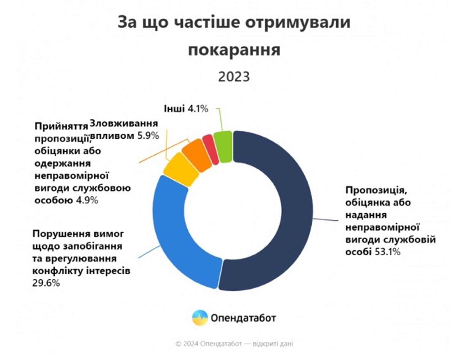 Відтак у 2022-2023 роках найбільше людей потрапило до реєстру через пропозицію чи обіцянку неправомірної вигоди за дії або бездіяльність у владі – 38,2% та 53,1% випадків відповідно.