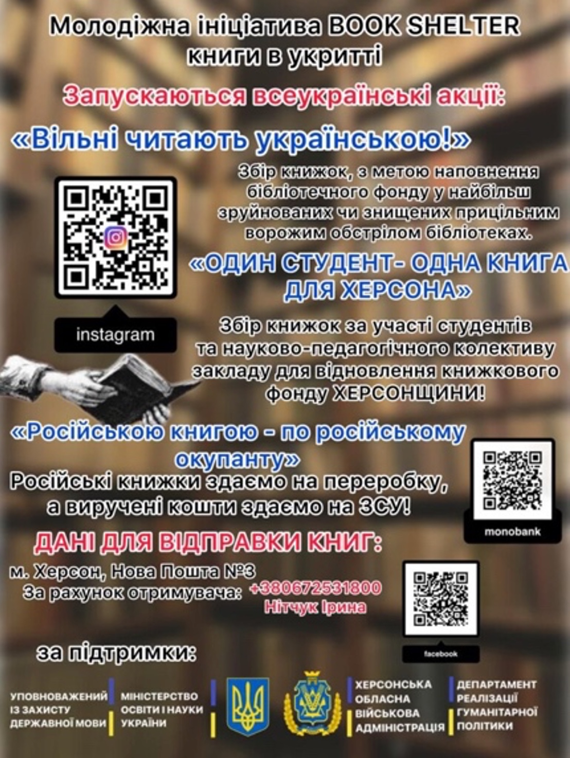 Зазначається, що в рамках молодіжної ініціативи «Book Shelter» реалізується проєкт збору книжок «Українська книга в укриттях Херсонщини». Його мета – утворити мобільні бібліотечні куточки в укриттях деокупованих населених пунктів Херсонської області. Наразі в регіоні обладнали вже 30 таких куточків.
