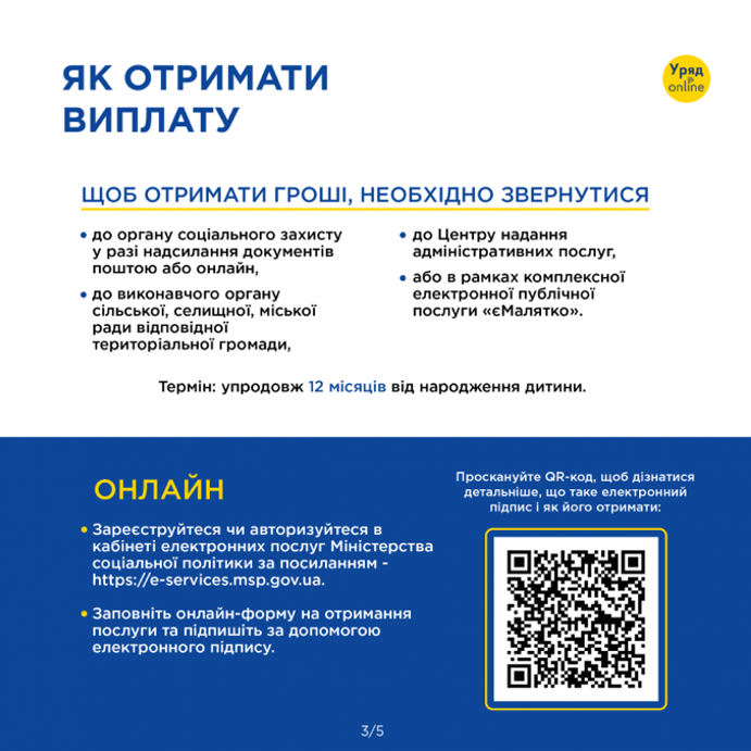 Зазначається, що наразі допомога при народженні дитини в Україні становить 41 280 гривень. Одноразово виплачується 10 320 гривень, а решта суми – по 860 гривень протягом 36 місяців.
