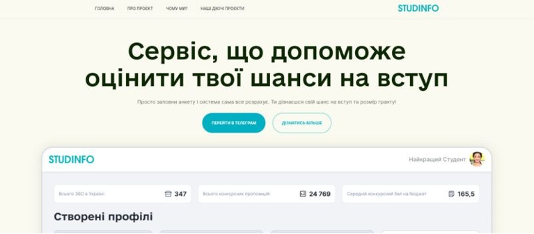 Українські розробники створили сервіс STUDINFO, який допоможе абітурієнтам оцінити їхні шанси на вступ до університету. Про це РеІнформ повідомляє з посиланням на сторінку розробника в Linkedіn, пише видання dev.ua.