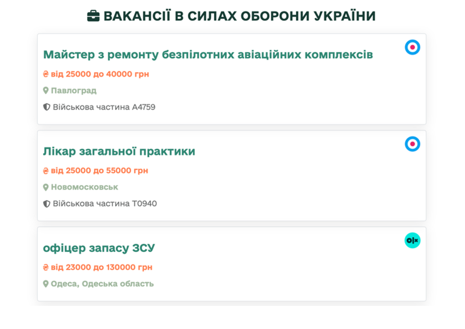 На сайті АрміяInform запрацював агрегатор вакансій до лав Сил оборони України, які були розміщені на платформах Work.ua, Olx та robota.ua. Про це РеІнформ повідомляє з посиланням на Міноборони.