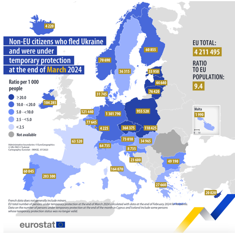 Станом на 31 березня 2024 року в країнах Європейського союзу статус тимчасового захисту мали 4,2 мільйона осіб, які залишили Україну внаслідок повномасштабного вторгнення. Про це повідомляє РеІнформ із посиланням на дані Євростату, пише Укрінформ.
