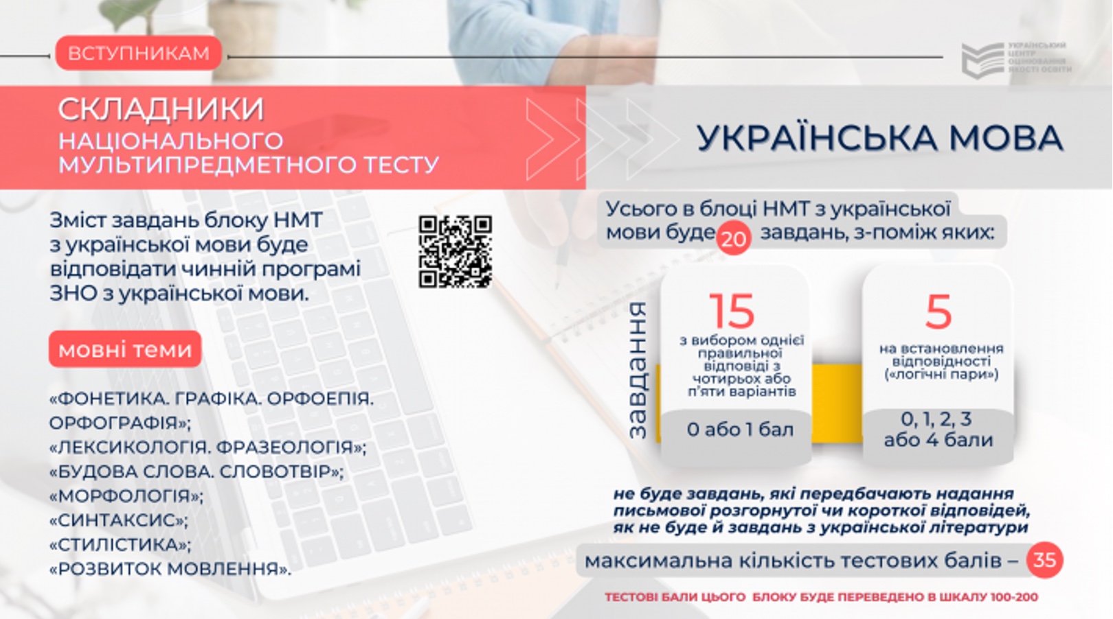Зазначається, що тест НМТ з української мови включатиме 20 завдань, серед яких: