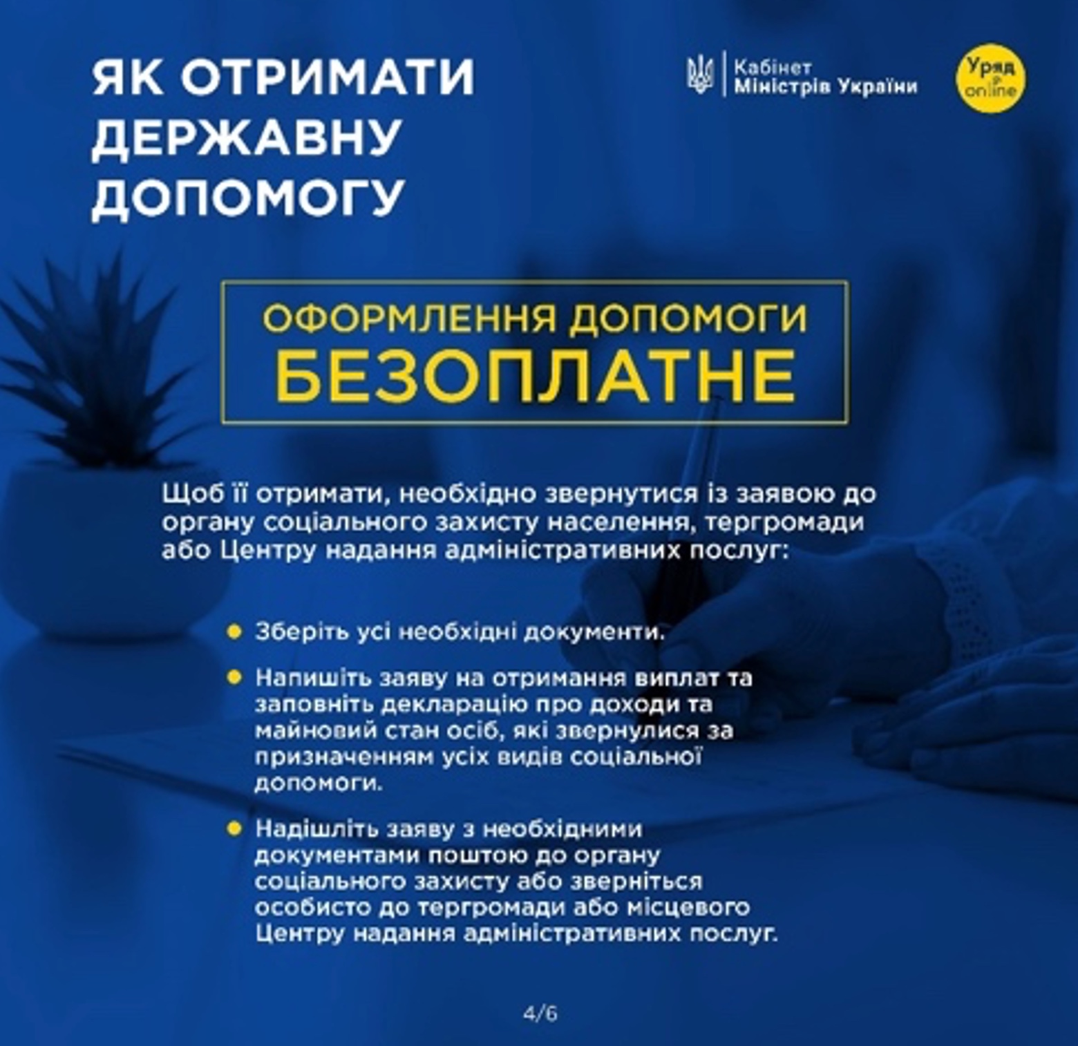 Оформлення допомоги безкоштовне. Щоб її отримати, необхідно звернутися із заявою до органу соціального захисту населення, тергромади або Центру надання адміністративних послуг: