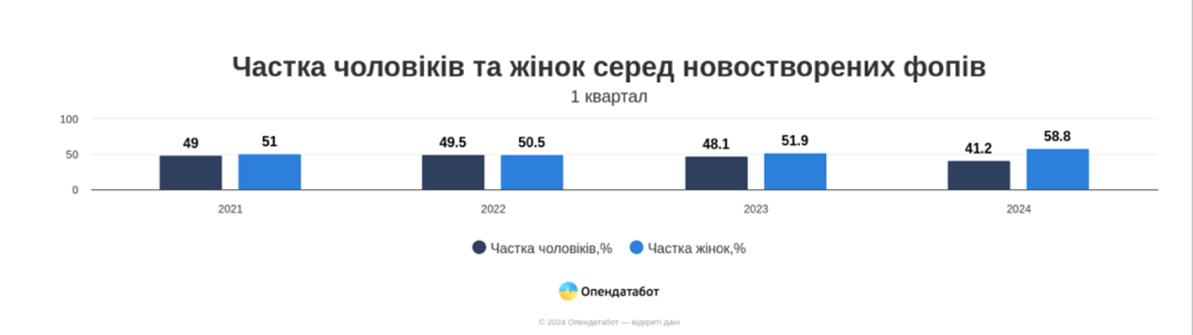 «Це більше половини – 59% – від загальної кількості нових справ та рекордний показник за останні роки. Чоловіки відкрили 30 496 нових справ за той самий час. Для порівняння, у 2021 році частка жінок складала 51% від загальної кількості новостворених фопів», – йдеться у повідомленні.