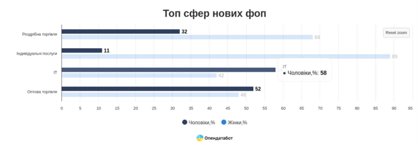 Зазначається, що найчастіше жінки-ФОПи обирають для своєї діяльності роздрібну торгівлю (68% жінок та 32% чоловіків), надання інших індивідуальних послуг (89% жінок та 11% чоловіків) та інформаційних послуг (63% жінок та 37% чоловіків).