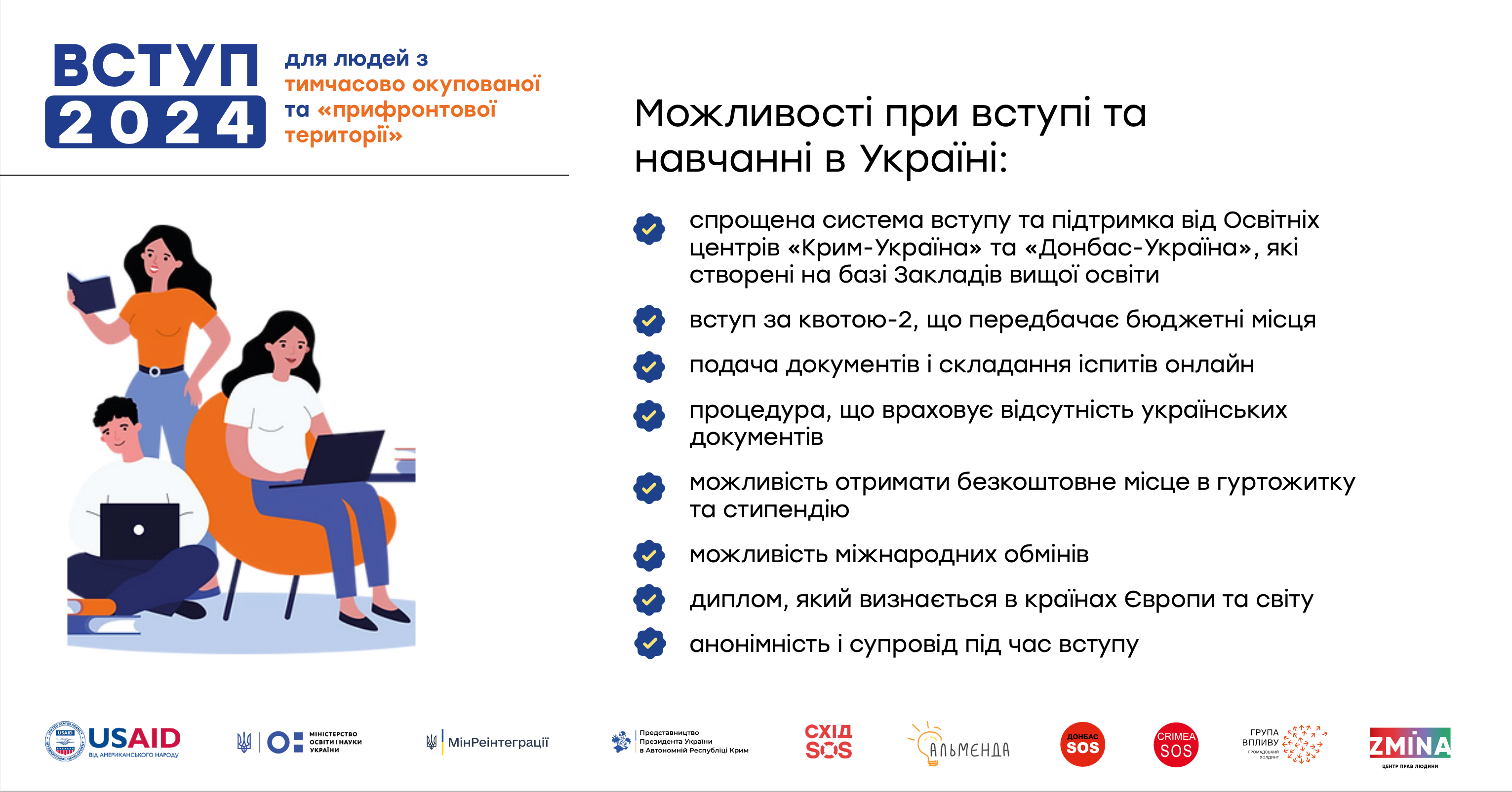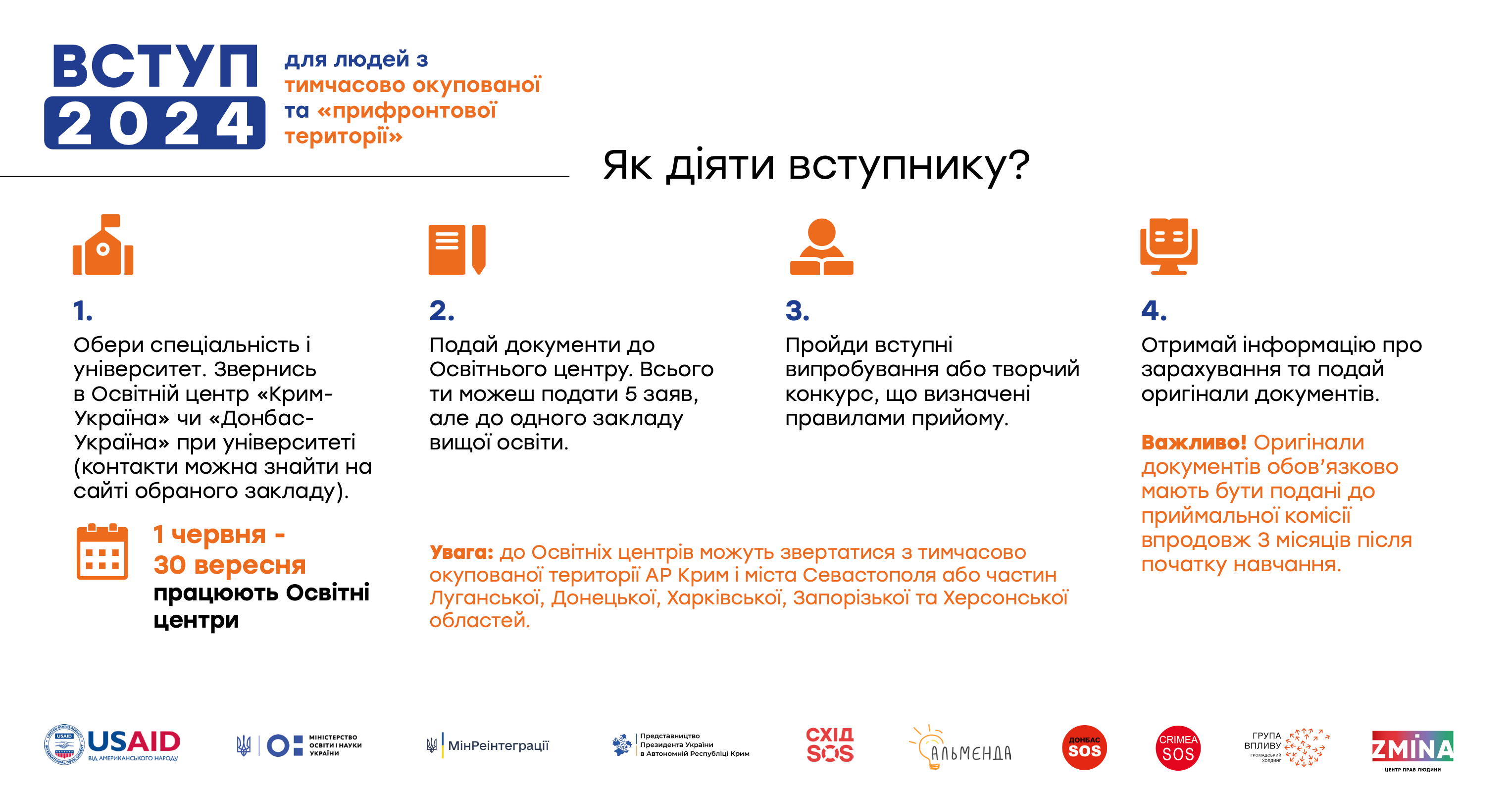 Вступна кампанія 2024 для вступників та вступниць із тимчасово окупованих та «прифронтових» територій за спрощеною системою вступу триває. Про це РеІнформ повідомляє з посиланням на Центр громадянської просвіти «Альменда».