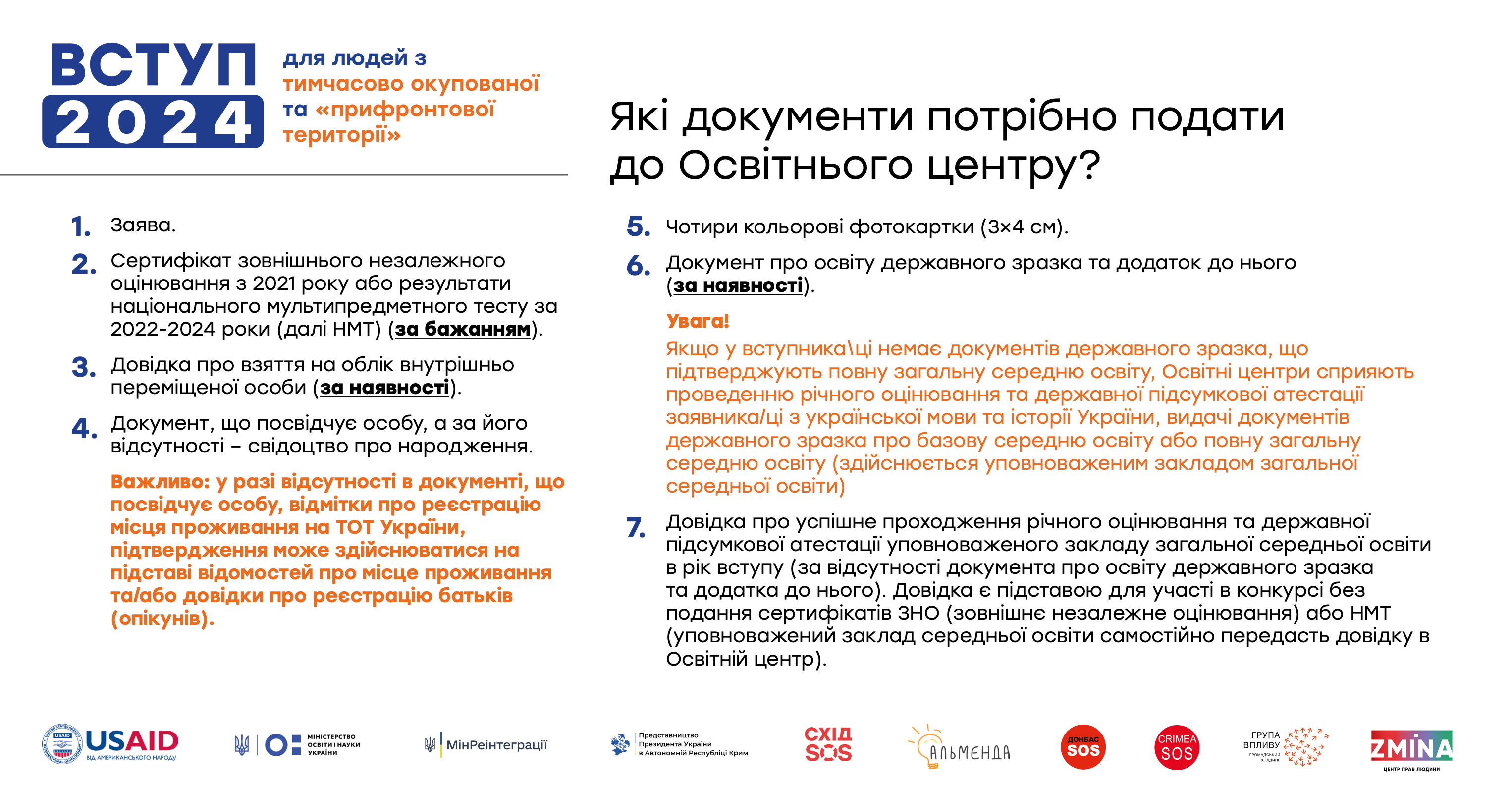 З 1 червня свою роботу почали Освітні центри «Донбас-Україна» та «Крим-Україна». Вони працюють до 30 вересня та допомогають саме вступникам із тимчасово окупованих територій та територій, на яких ведуться активні бойові дії. Ця допомога може полягати як у наданні консультацій, так і в сприянні в отриманні документів, що посвідчують особу.