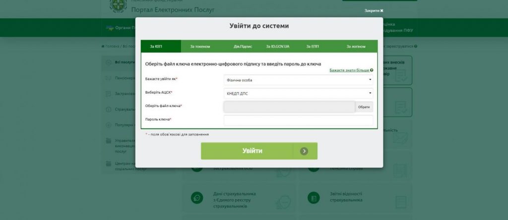 1. Зайдіть в особистий кабінет на вебпорталі електронних послуг Пенсійного фонду України за допомогою кваліфікованого електронного підпису (КЕП).