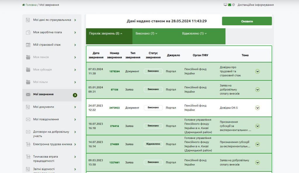 7. Результат обробки заяви перегляньте в особистому кабінеті в розділі «Мої звернення». Як тільки фахівець Фонду опрацює Анкету, звернення набуде статусу «Виконано».