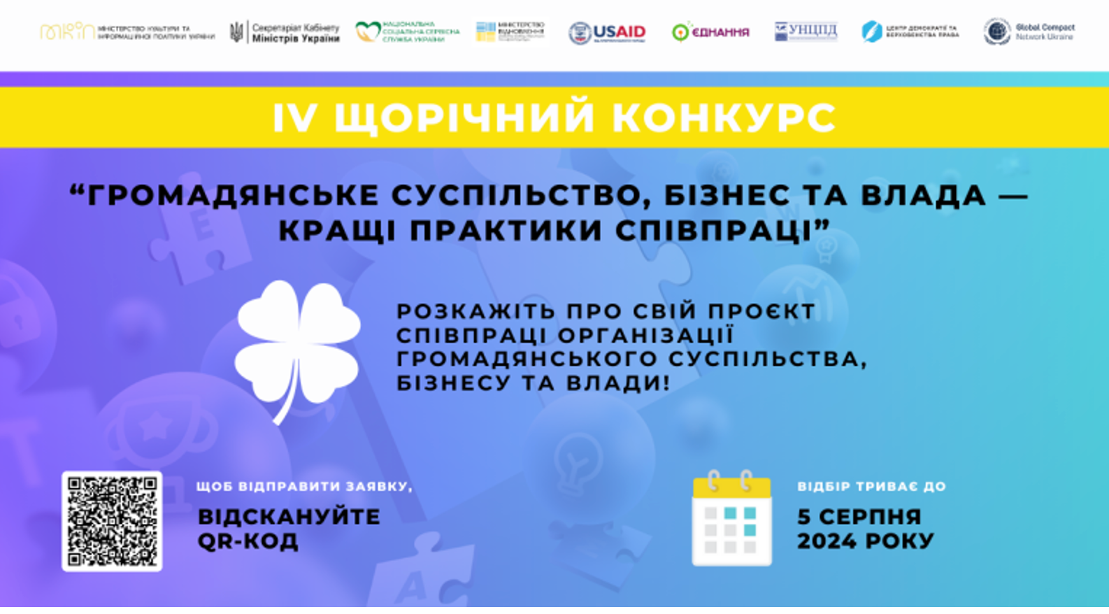 Цей проєкт «Ініціатива секторальної підтримки громадянського суспільства України» спільно з Міністерством культури та інформаційної політики України, Секретаріатом Кабінету Міністрів України, Міністерством розвитку громад, територій та інфраструктури України, Національною соціальною сервісною службою України та Глобальним договором ООН в Україні запускає IV щорічний Конкурс історій «Громадянське суспільство, бізнес та влада – кращі практики співпраці».