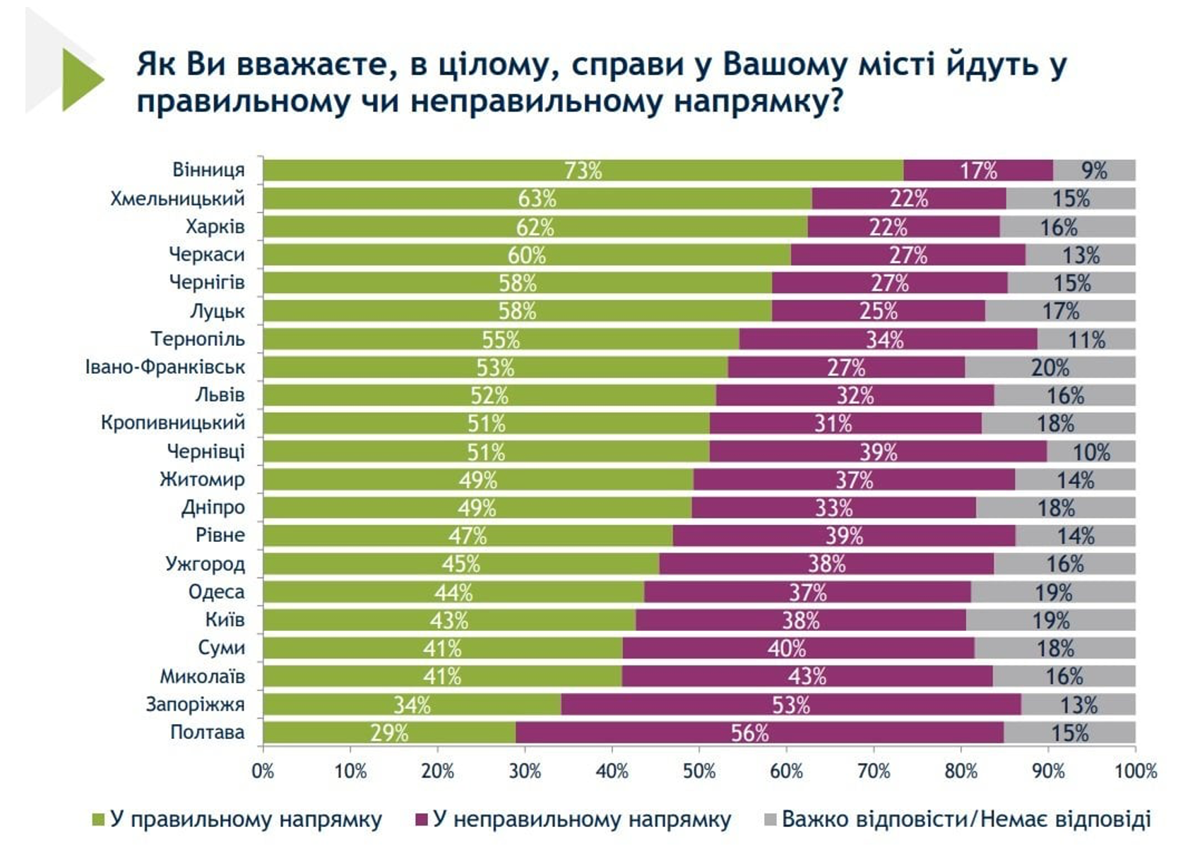 Хмельницький (63%) і Харків (62%) посіли другу і третю позиції за підтримкою напрямку розвитку міста. За ними йдуть Черкаси, Чернігів, Луцьк, Тернопіль, Івано-Франківськ, Львів і Кропивницький, де від 60% до 51% опитаних вважають, що їхні міста розвиваються в правильному напрямку.