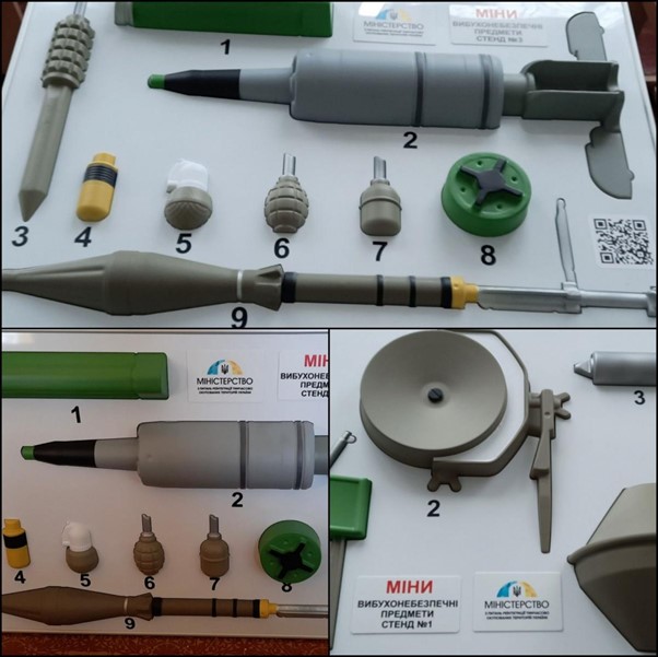 Для зручності стенди розроблені в об’ємному форматі, тож громадяни зможуть детально розглянути різні види мін та вибухонебезпечних предметів. А для ефективності проведення просвітницьких заходів на стендах розміщено QR-коди з детальною інформацією про вибухонебезпечні предмети.