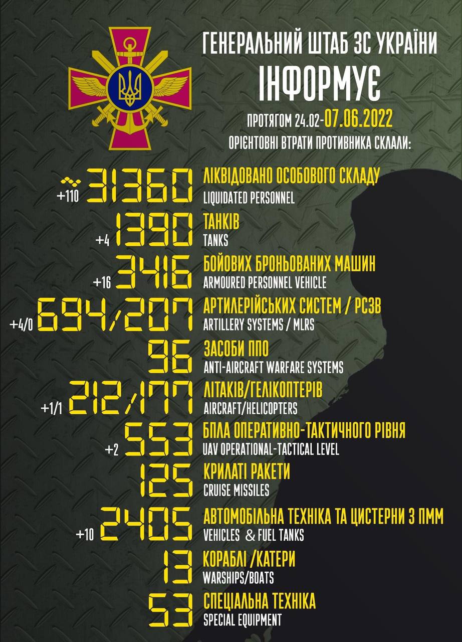 7 Червня 2022, 15:00За час повномасштабної агресії рф проти України, з 24 лютого по 7 червня, загальні втрати живої сили ворога орієнтовно становлять 31360 осіб. Про це повідомляє РеІнформ із посиланням на Генеральний штаб ЗСУ.