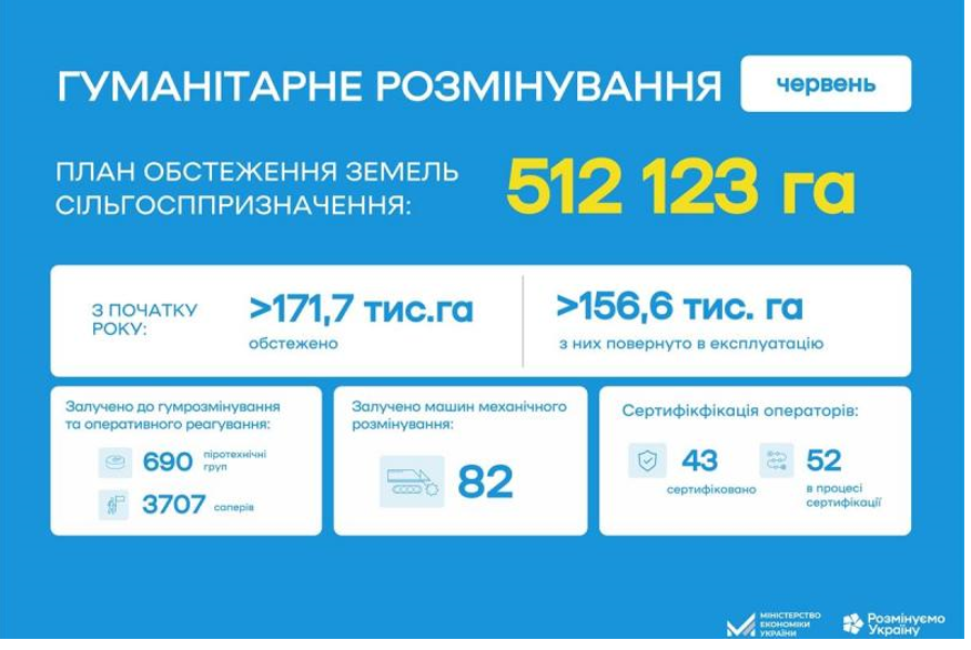 Зазначається, що протягом півріччя Україна посилила спроможності у сфері гуманітарного розмінування. Зокрема, минулого року Україна не мала жодної машини для розмінування, а на початку цього року сапери використовували 30 одиниць такої техніки, а в червні — 82.