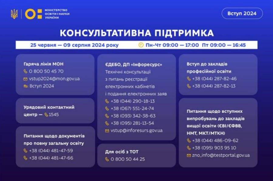 «Розпочала роботу консультативна телефонна гаряча лінія МОН та чат-бот для запитань про вступ 2024. Якщо ви маєте запитання – звертайтеся на гарячу лінію МОН за номером 0 (800) 50-45-70, або пишіть на пошту: vstup2024@mon.gov.ua», – йдеться у повідомленні.
