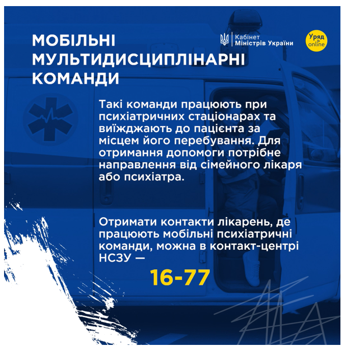 Мобільні мультидисциплінарні команди працюють при психіатричних стаціонарах та виїжджають до пацієнта за місцем його перебування.