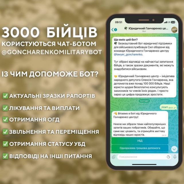 «Ми щодня працюємо над покращенням боту, однак якщо ви не знайшли відповідь на своє запитання, наша команда з радістю надасть індивідуальну консультацію. Для цього працюють безкоштовні гарячі лінії для військовослужбовців та членів їхніх родин. Звертатися можна за номерами +380672042206, +380951168887 або +380937440036, а також писати на електронну пошту lawyergoncharenkoua@gmail.com», – йдеться у повідомленні.