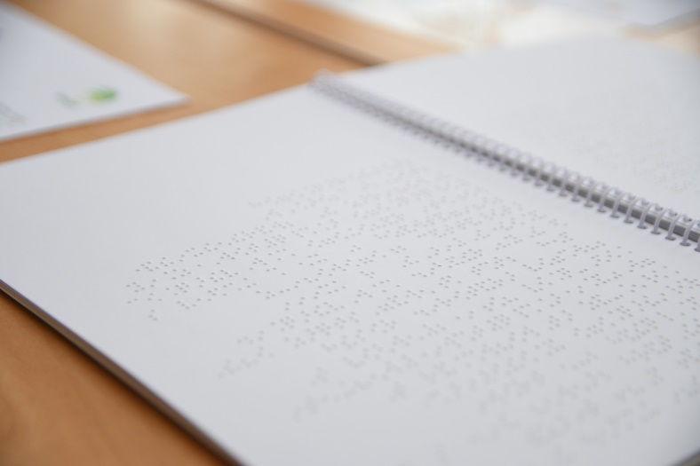 Також підписи на карті продубльовані шрифтом Брайля. Тактильними є і звичайні букви. Це зробили для того, щоби військові, які втратили зір внаслідок бойових дій та не володіють шрифтом Брайля, змогли прочитати букви на дотик.