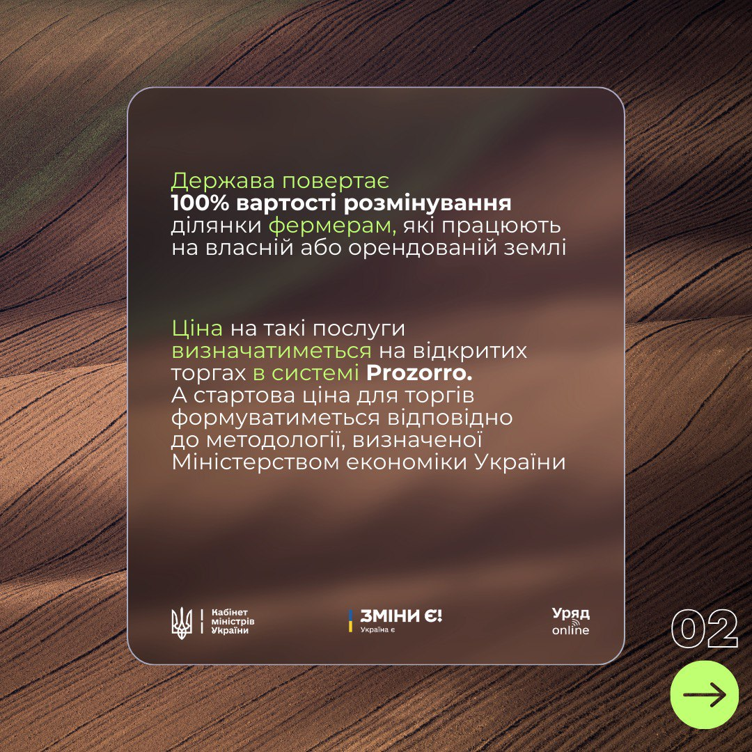 Держава повертає 100% вартості розмінування ділянки фермерам, які працюють на власній або орендованій землі. Про це повідомляє Урядовий портал. Про це РеІнформ повідомляє з посиланням на сайт Мінреінтеграції.
