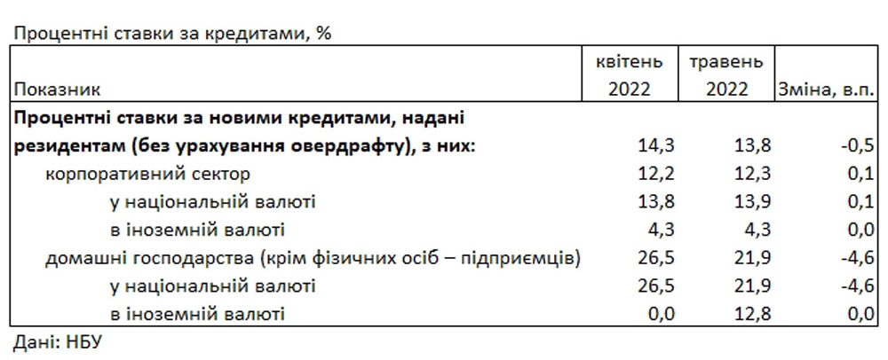 Процентні ставки за новими кредитами банків для населення в травні 2022 року в національній валюті становили 21,9% річних. Про це повідомляє РеІнформ із посиланням на Національний банк України.