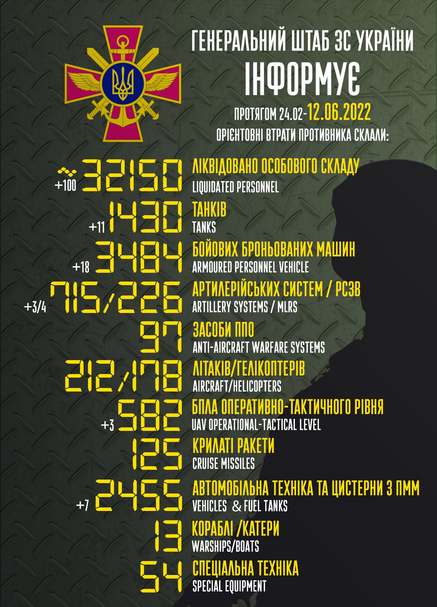 12 Червня 2022, 11:31Від початку повномасштабної агресії проти України, з 24 лютого по 12 червня, загальні втрати живої сили ворога орієнтовно склали 32 150 осіб.