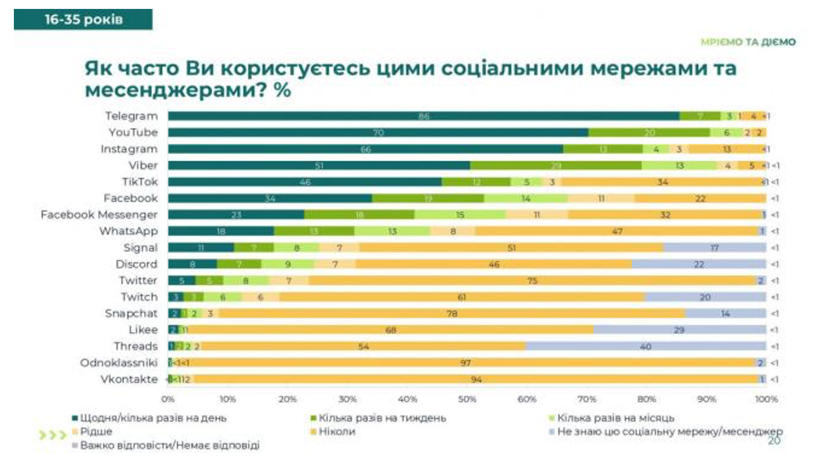 П’ятірку найзатребуваніших замикають вайбер і тікток, щодня або частіше їх переглядають 51% та 46% респондентів. Іншими соцмережами в цій віковій групі користується від 34% до близько 1% опитаних.