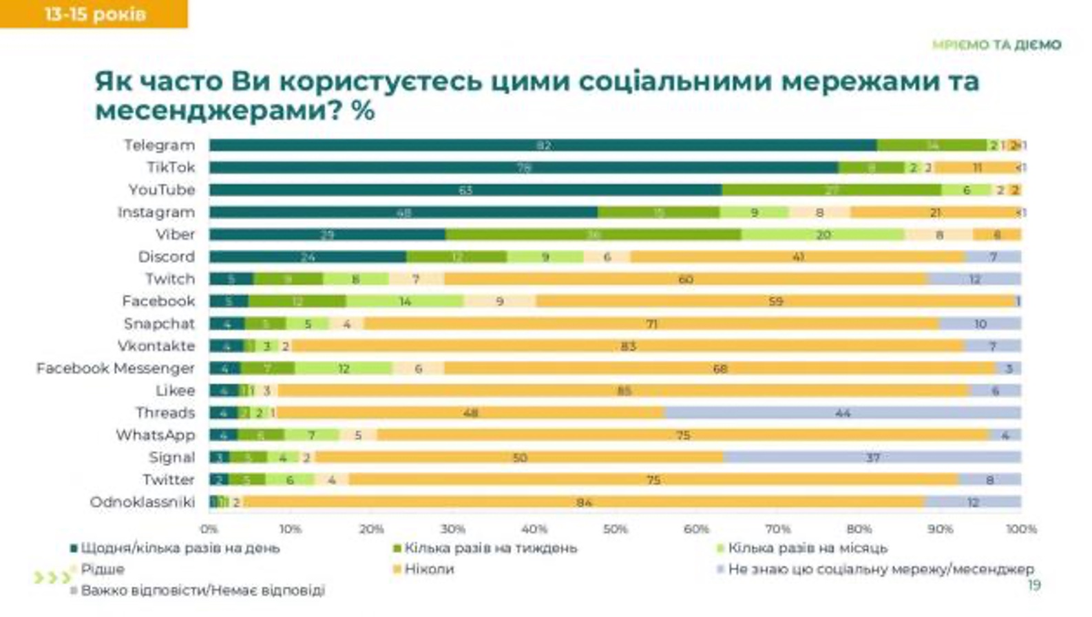 Зокрема, серед підлітків віком 13-15 років найзатребуванішими є телеграм (82%), його переглядають щодня або кілька разів на день. Далі йде тікток (78%), ютуб (63%), інстаграм (48%) та вайбер (29%). Іншими соцмережами в цій віковій групі користується від 24 до 1%.