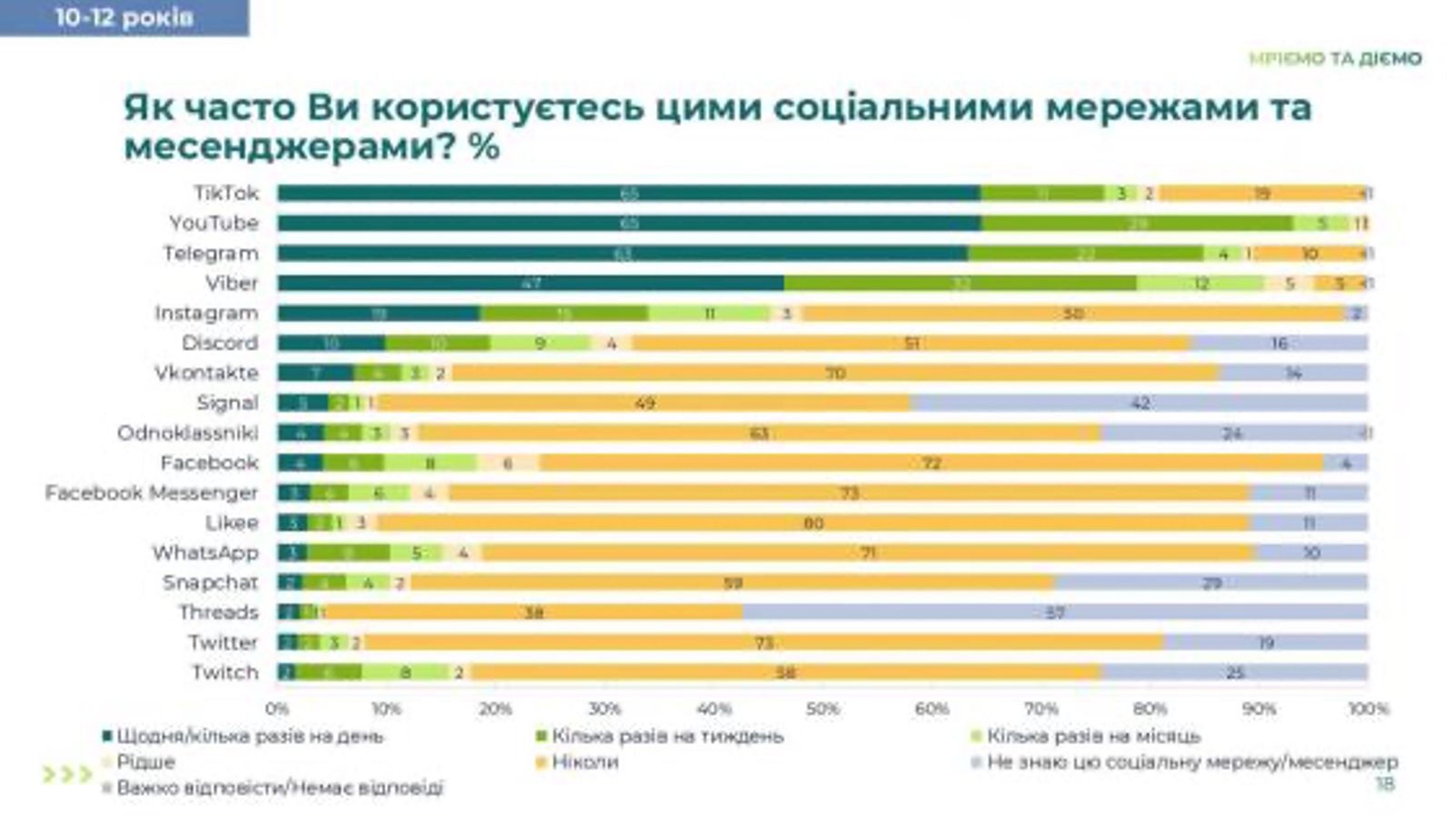 Діти віком 10-12 років найактивніше користуються тіктоком (65%), ютубом (65%), телеграмом (63%). Також щодня вони користуються вайбером (47%) та інстаграмом (19%). Іншими соцмережами в цій віковій групі користується від 10 до 2%.