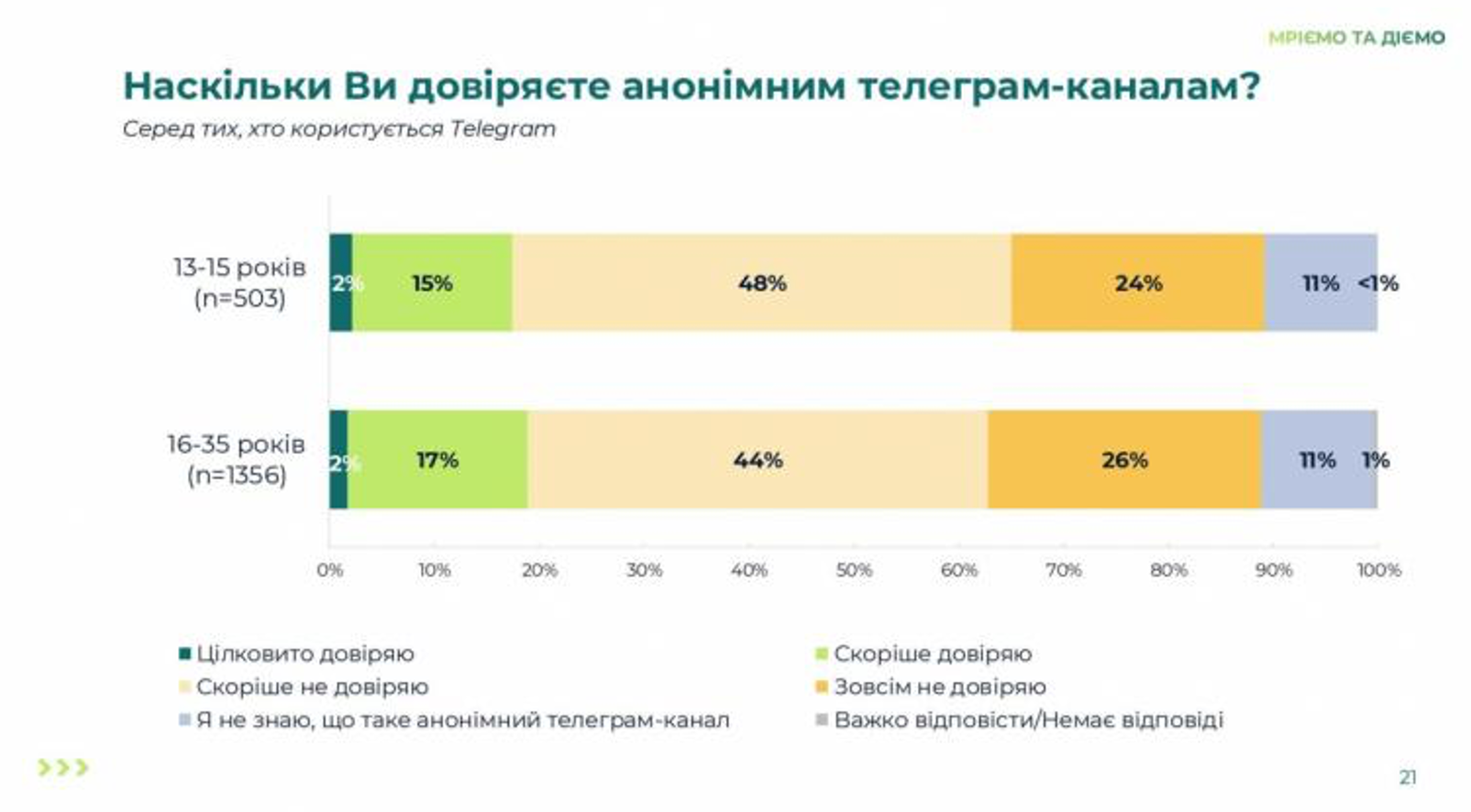 Зважаючи на високий рівень затребуваності месенджера «Телеграм», у молоді, віком 13-15 років та 16-35 років також поцікавилися, наскільки вони довіряють анонімним телеграм-каналам.