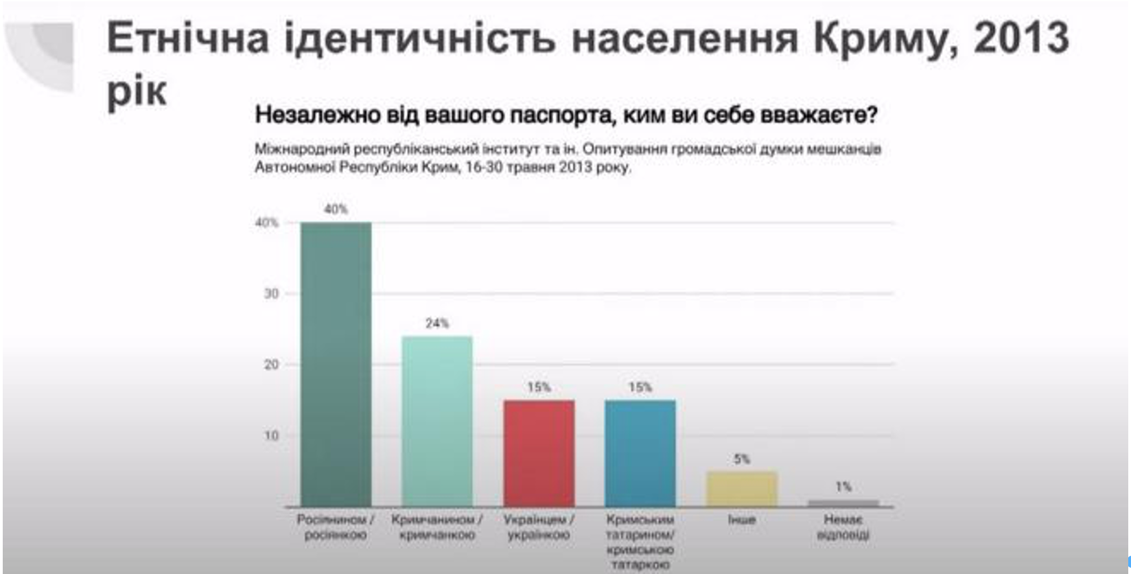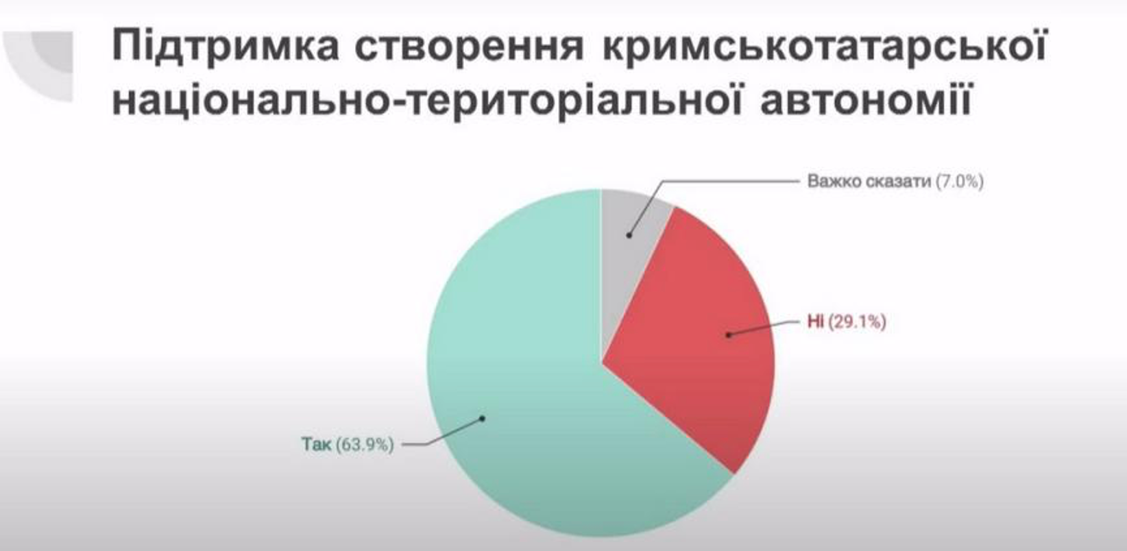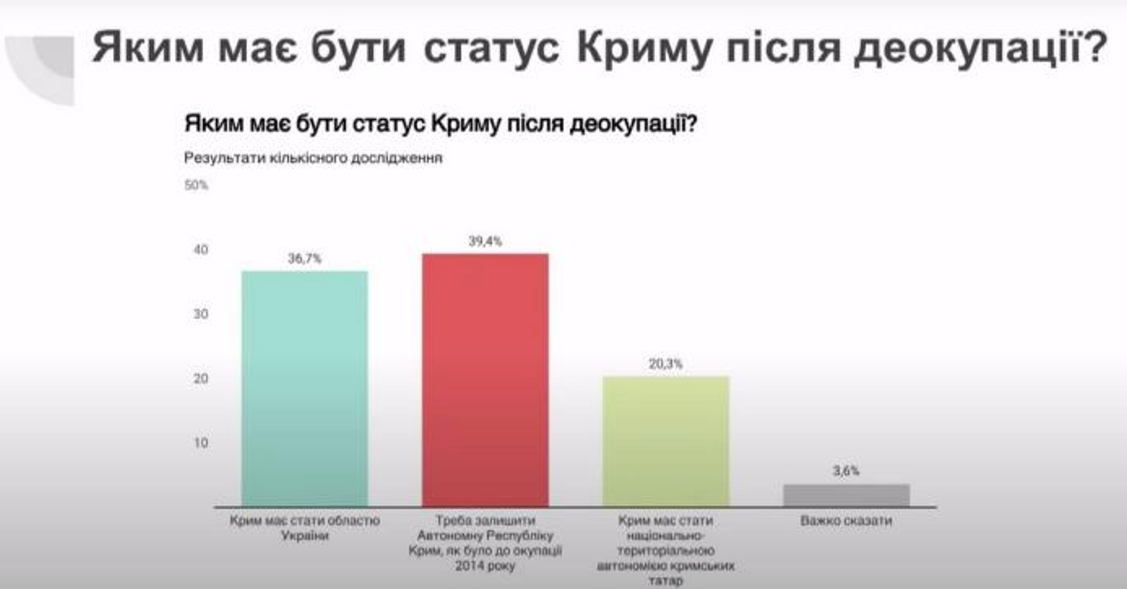 «Тобто питання Криму лишається присутнім для свідомості людей. Це складова дійсно справедливого миру і для більшості українців важливо, щоб він був деокупований. Українці дещо більш обережні щодо питань термінів фізичної деокупації. Близько половини респондентів говорили, що це може відбутися короткостроково – до 5 років. (…) Абсолютна меншість говорила, що це взагалі ніколи не відбудеться», –зауважив Грушецький.
