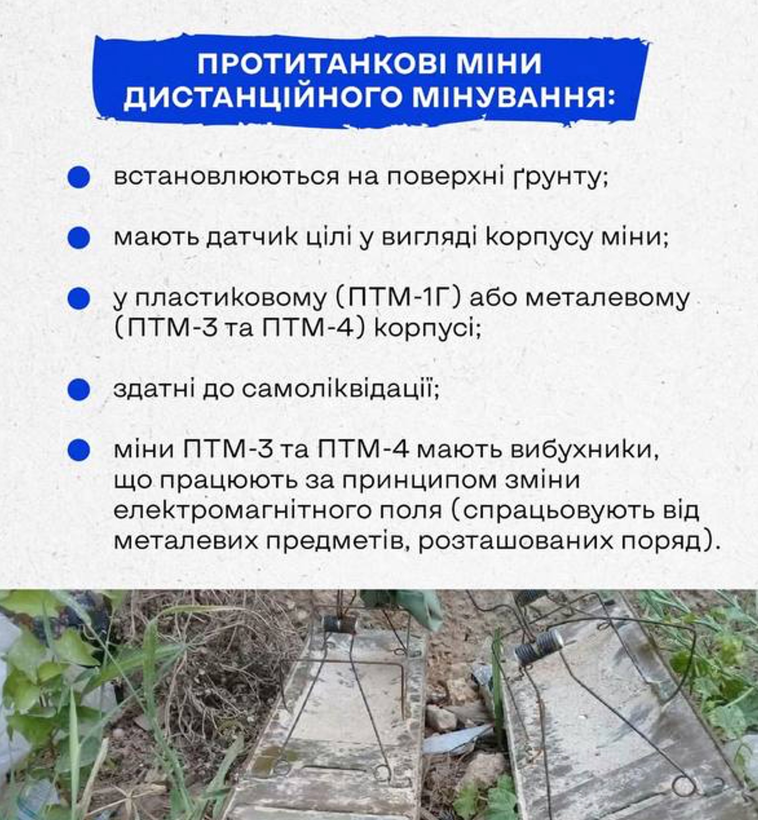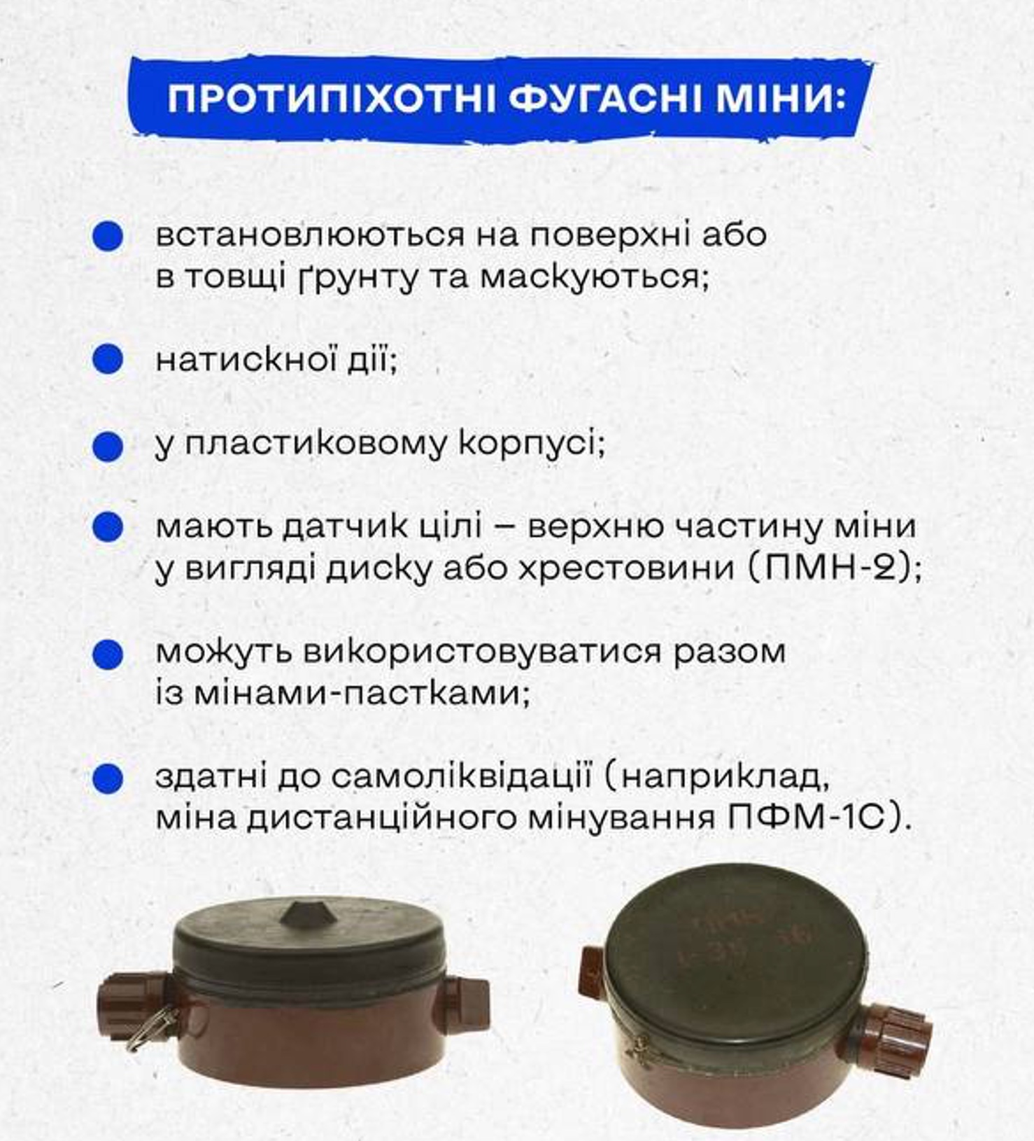 Також загарбники використовують інші різновиди мін – протитанкові, протипіхотні осколкової дії, протипіхотні фугасні, міни-сюрпризи, міни-пастки. Усі вони є вкрай небезпечними!Розповідаємо, як їх розпізнати та як від них уберегтися: