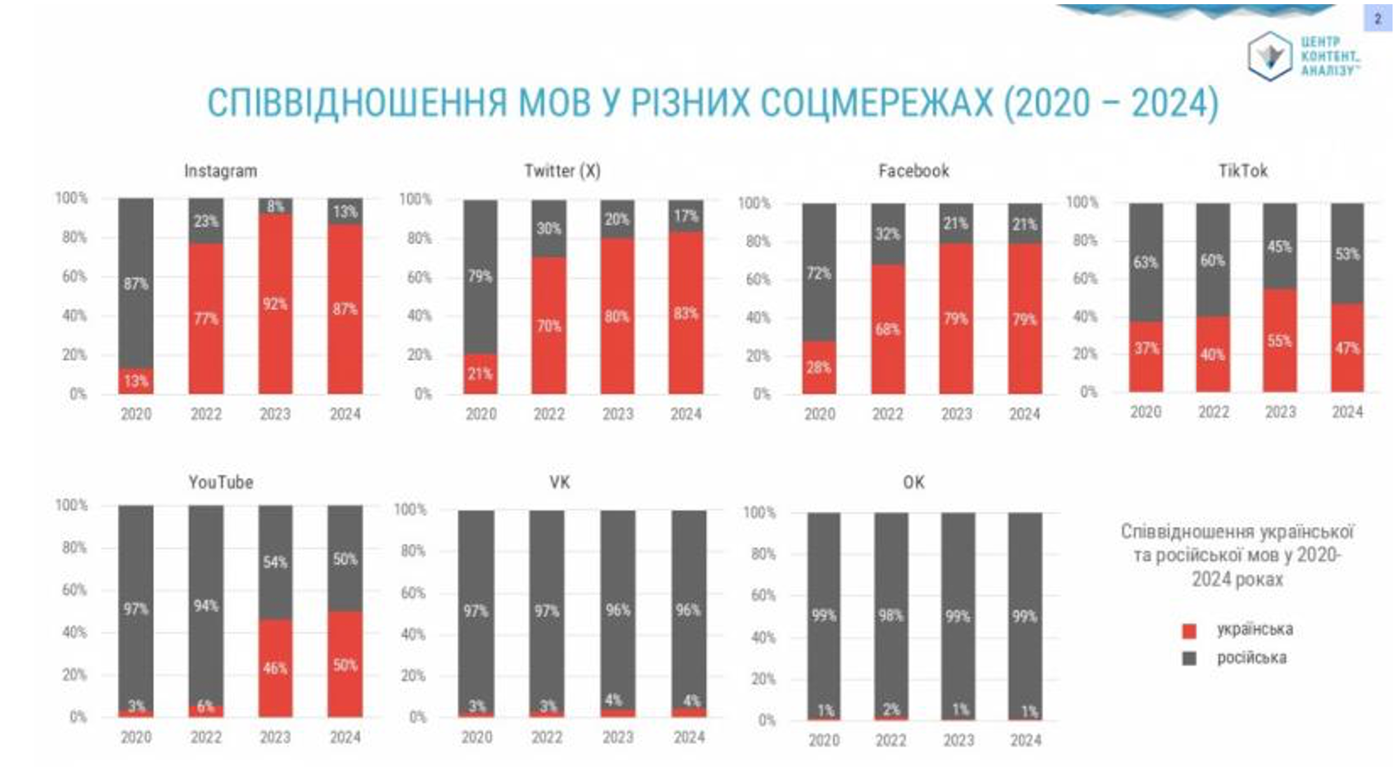 Співвідношення публікацій українською та російською мовами в «Інстаграмі» становить 87% до 13%, X – 83% до 17%, у «Фейсбуці» – 79% до 21%.