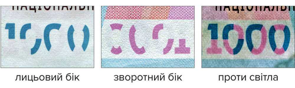 Перевірте наскрізний елемент, тобто поєднане зображення. При розгляді проти світла всі елементи цифрового позначення номіналу банкноти збігаються, доповнюють один одного. Цифрове позначення повинно бути без розривів і зсувів.