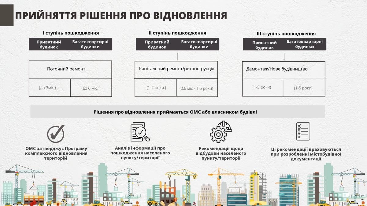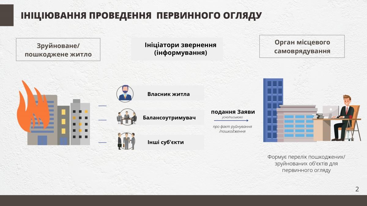 Докладну інформацію про порядок дій щодо вирішення проблеми пошкодженого/зруйнованого житла можна переглянути у презентації: