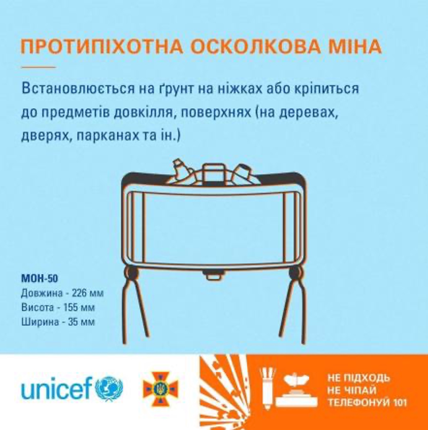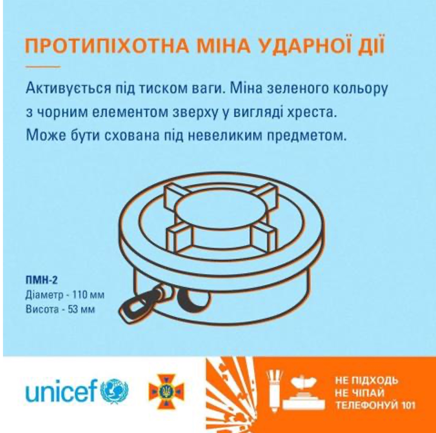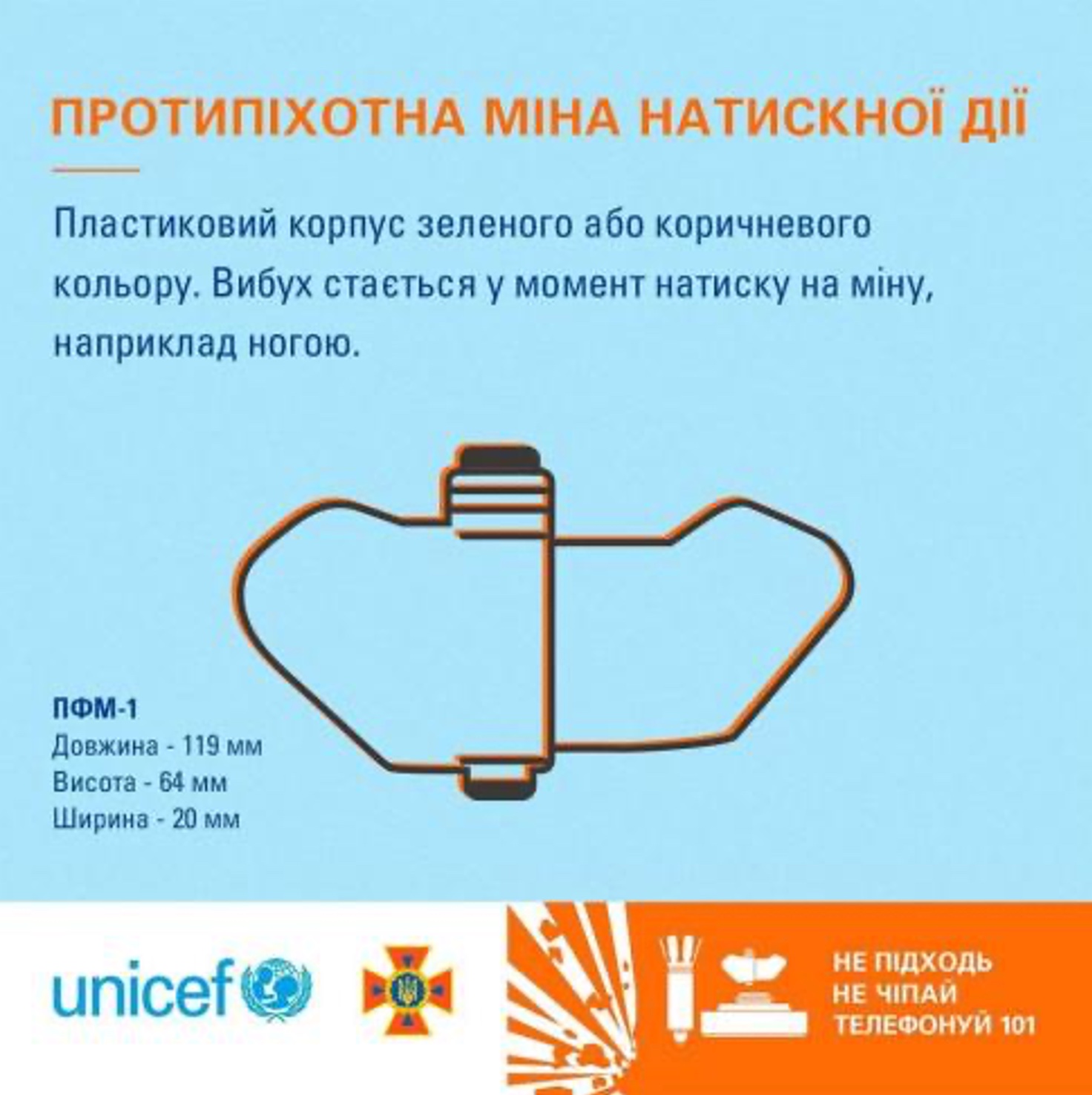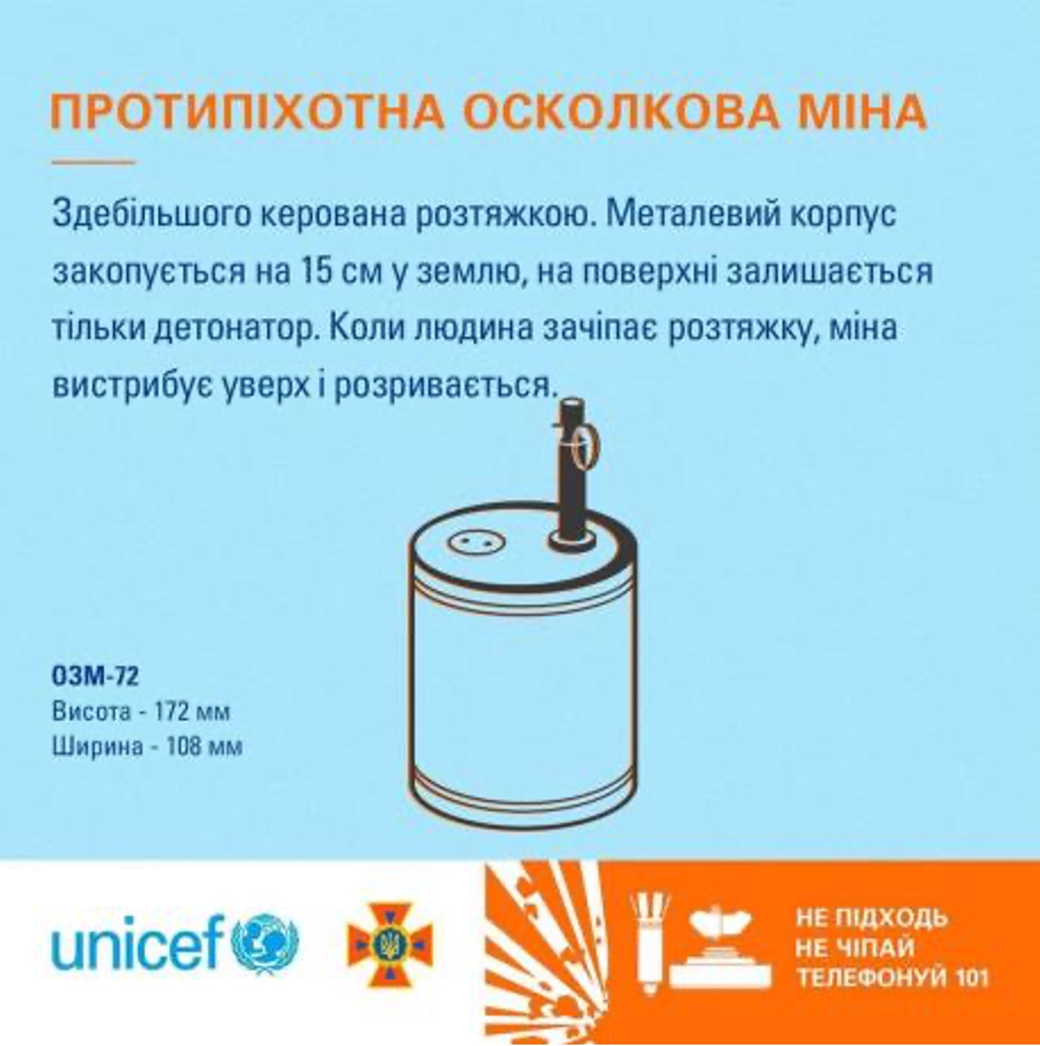 «Вибух може статися, коли хтось наближається або безпосередньо торкається до міни….За способом завдання шкоди протипіхотні міни бувають фугасні й осколкові. Осколкові міни зазвичай мають готові уражальні елементи: металеві кульки, циліндри, смужки. Фугасні міни вражають вибухом», – йдеться у повідомленні.