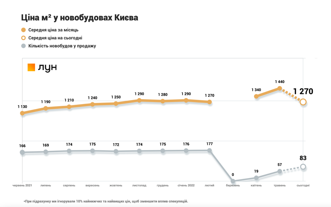 Це вивело середню ціну на рівень лютневої – 1270 доларів (44 577 грн) за кв. метр.