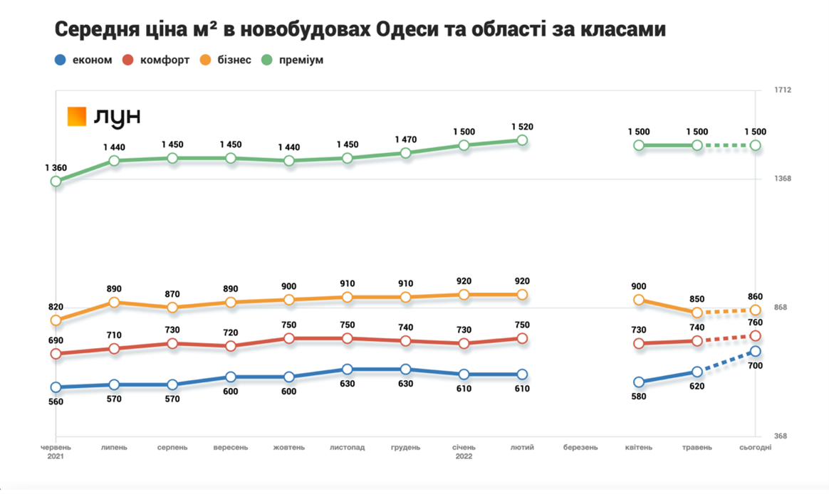 Серед усіх південних областей відновлення будівництва найбільш динамічне саме в Одеській області. Зміна вартості у кожному з класів також сигналізує, що забудовники намагаються знайти оптимальну ціну за нинішніх умов.
