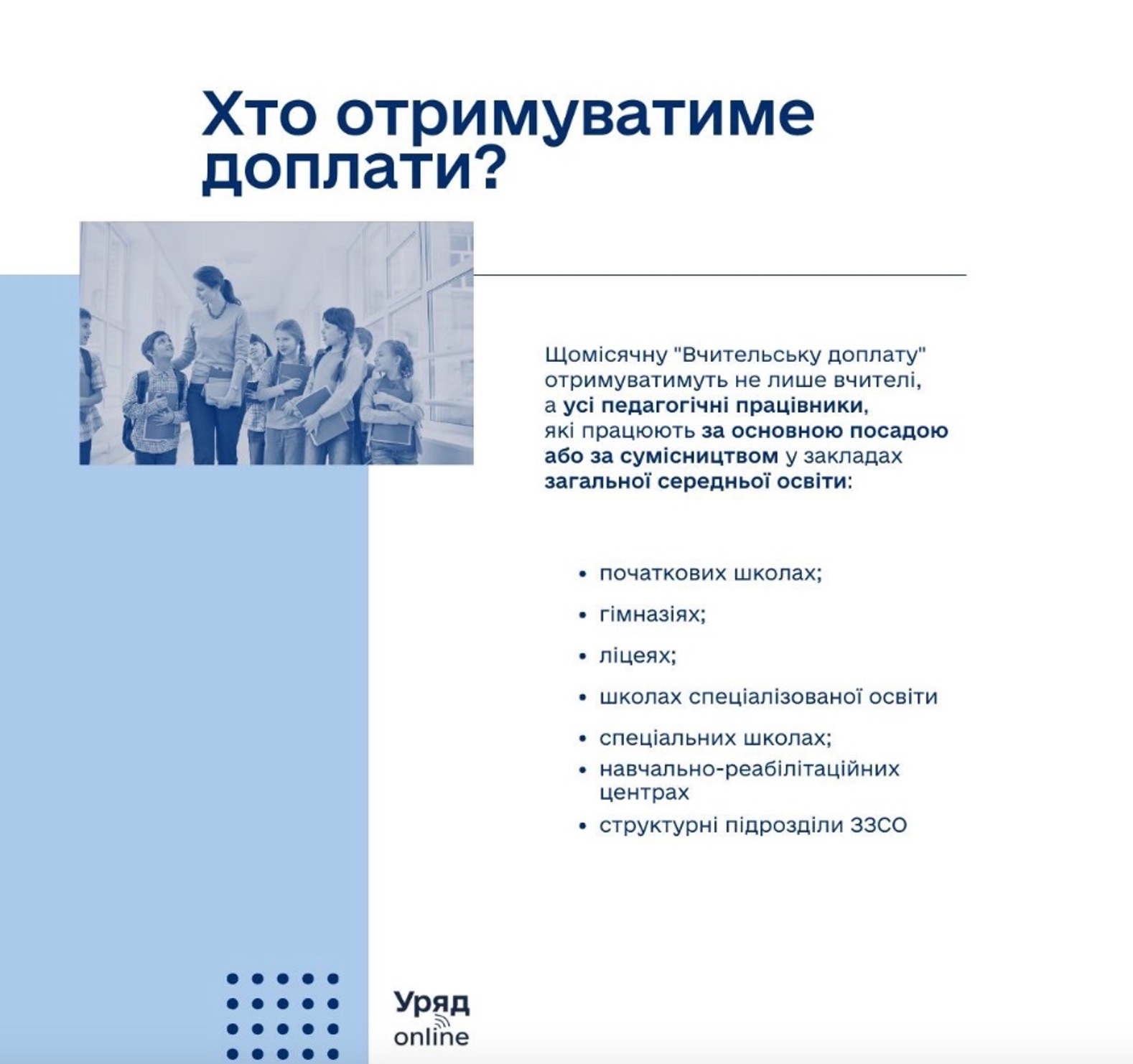 Тепер усі педагогічні працівники закладів загальної середньої освіти зможуть отримувати щомісячну «Вчительську доплату». Про це РеІнформ повідомляє з посиланням на Уряд online.