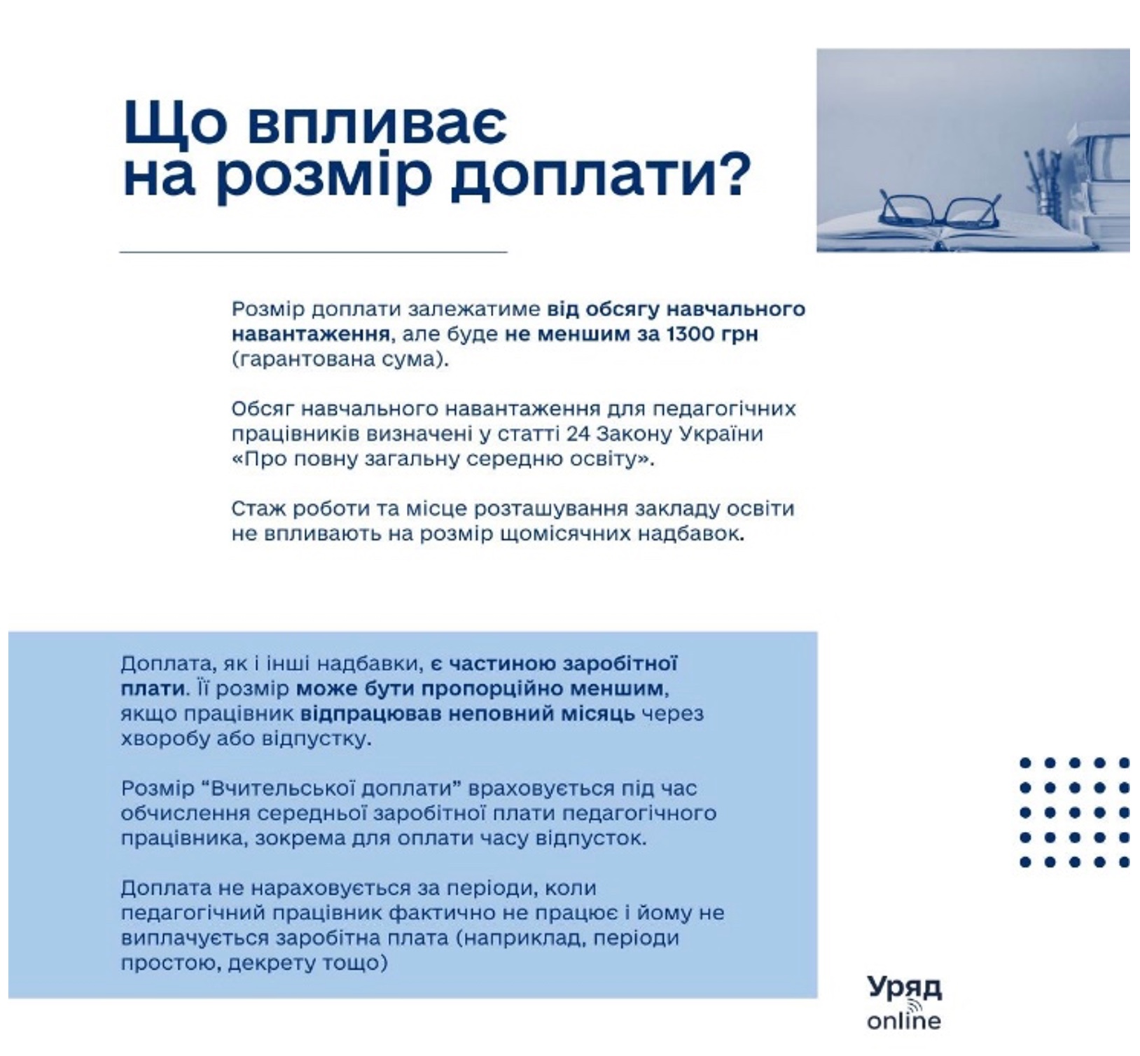 Розмір доплати визначатимуть залежно від обсягу навчального навантаження, але вона не буде меншою за гарантовану суму 1300 гривень.