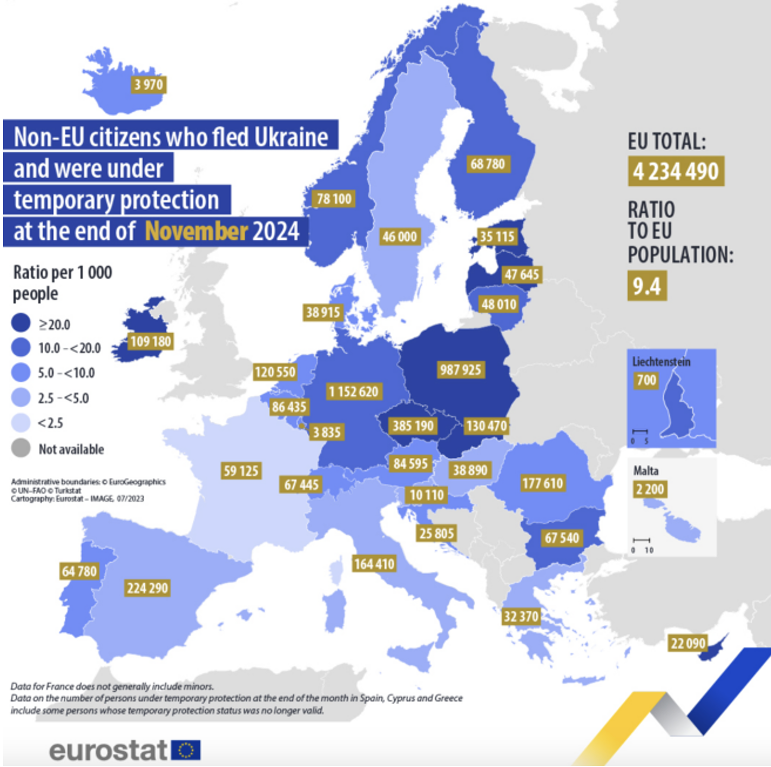 Станом на 30 листопада минулого року 4,2 мільйона українців мали статус тимчасового захисту в країнах Європейського союзу. Про це РеІнформ повідомляє з посиланням на дані Євростату, пише видання «Радіо Свобода».