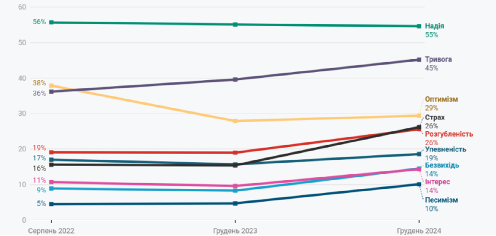 У порівнянні з серпнем та груднем 2023 року, респонденти частіше відчувають негативні емоції, такі як страх (+11% за рік), розгубленість (+7% за рік), безвихідь (+6% за рік), тривогу (+6% за рік) і песимізм (+5% за рік), коли думають про своє майбутнє.