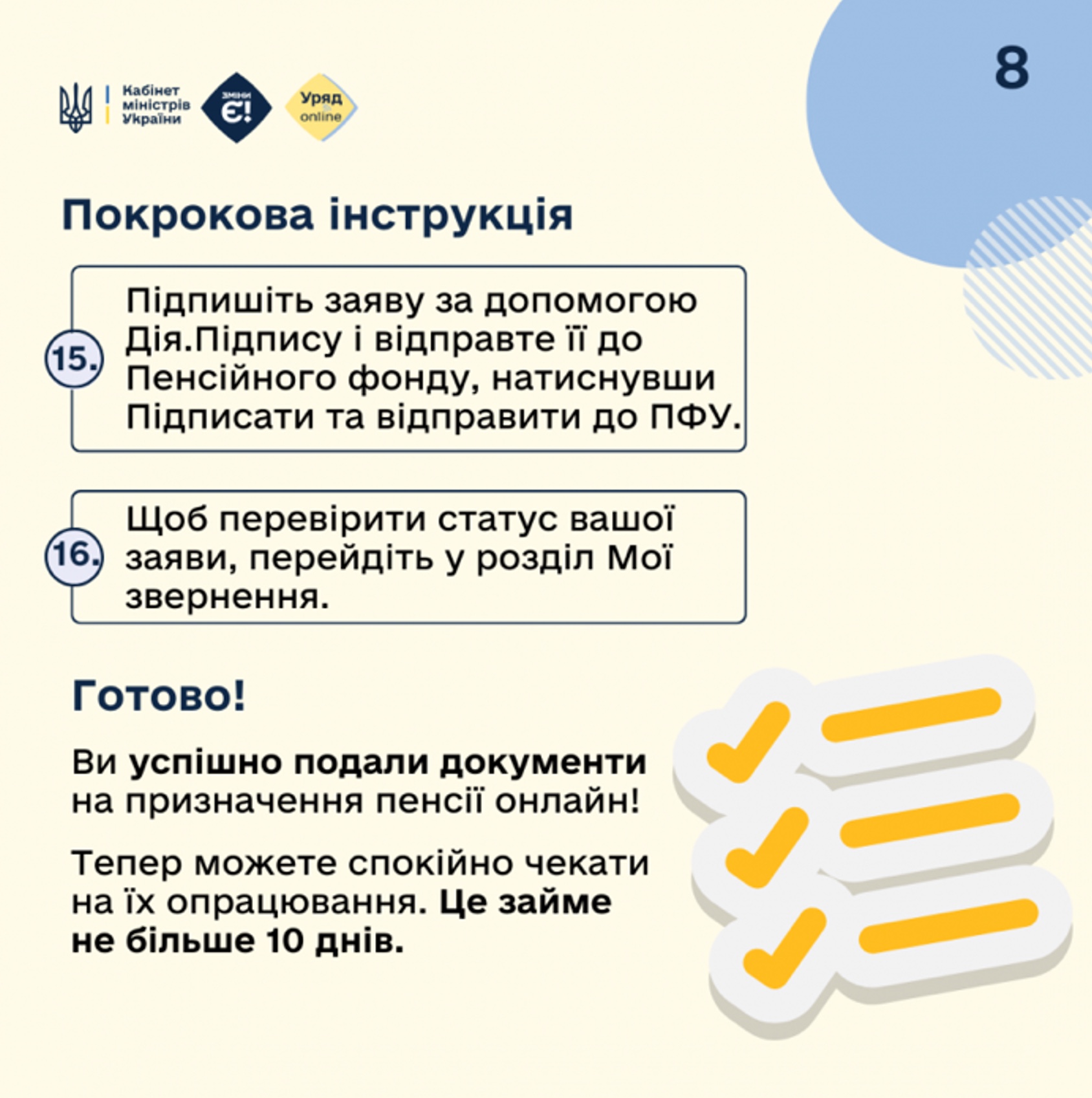 Після успішного подання документів на призначення пенсії онлайн необхідно дочекатися, допоки їх опрацюють. Це має зайняти не більше 10 днів.