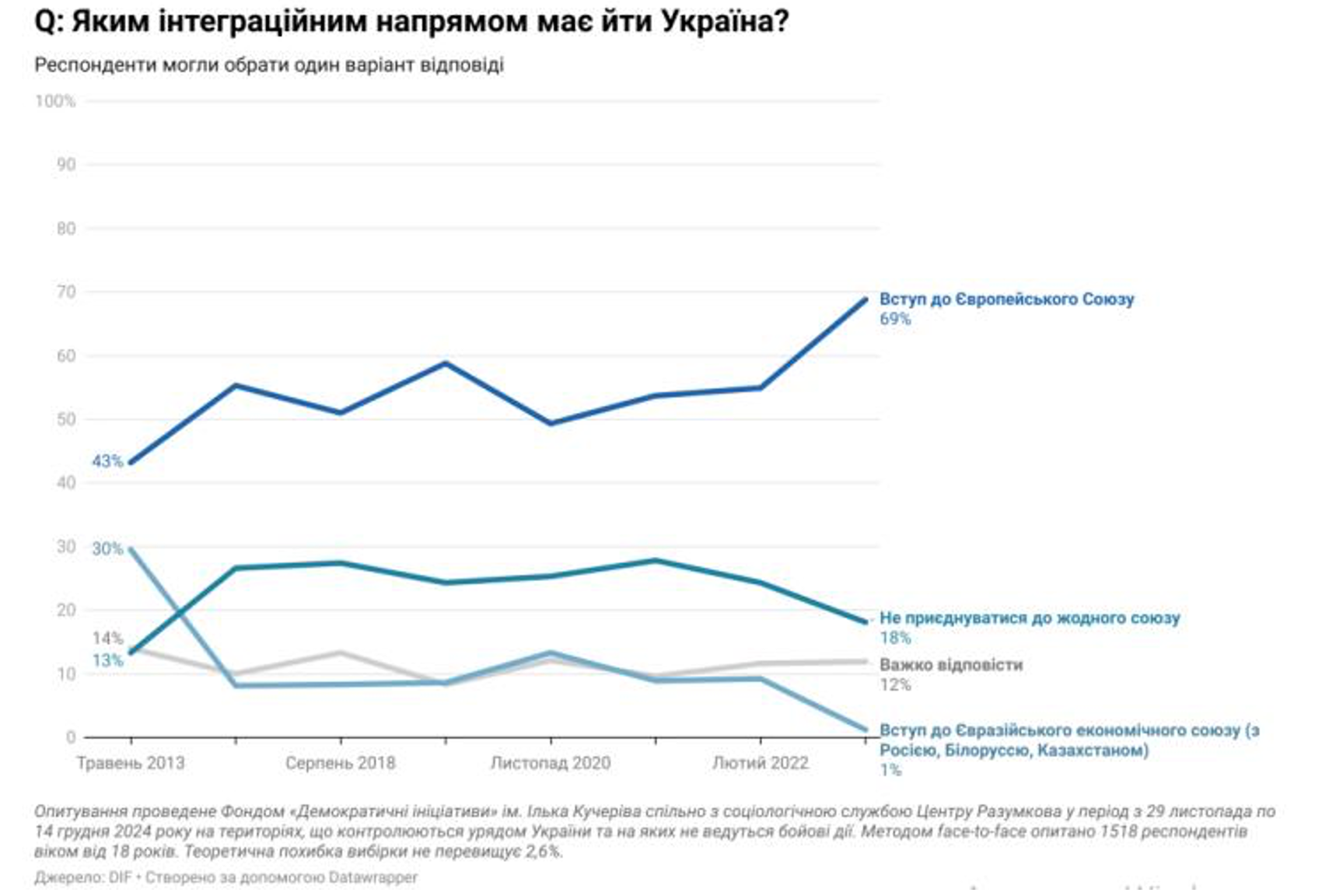69% опитаних українців вважають, що вступ до Європейського Союзу був би найкращим інтеграційним напрямом для України.